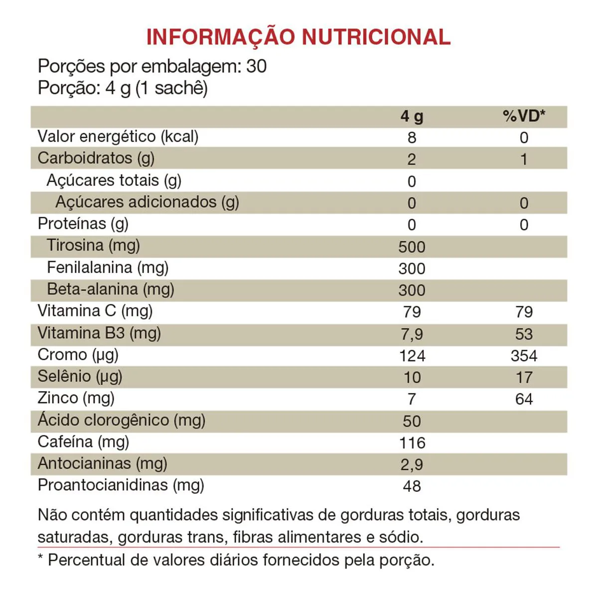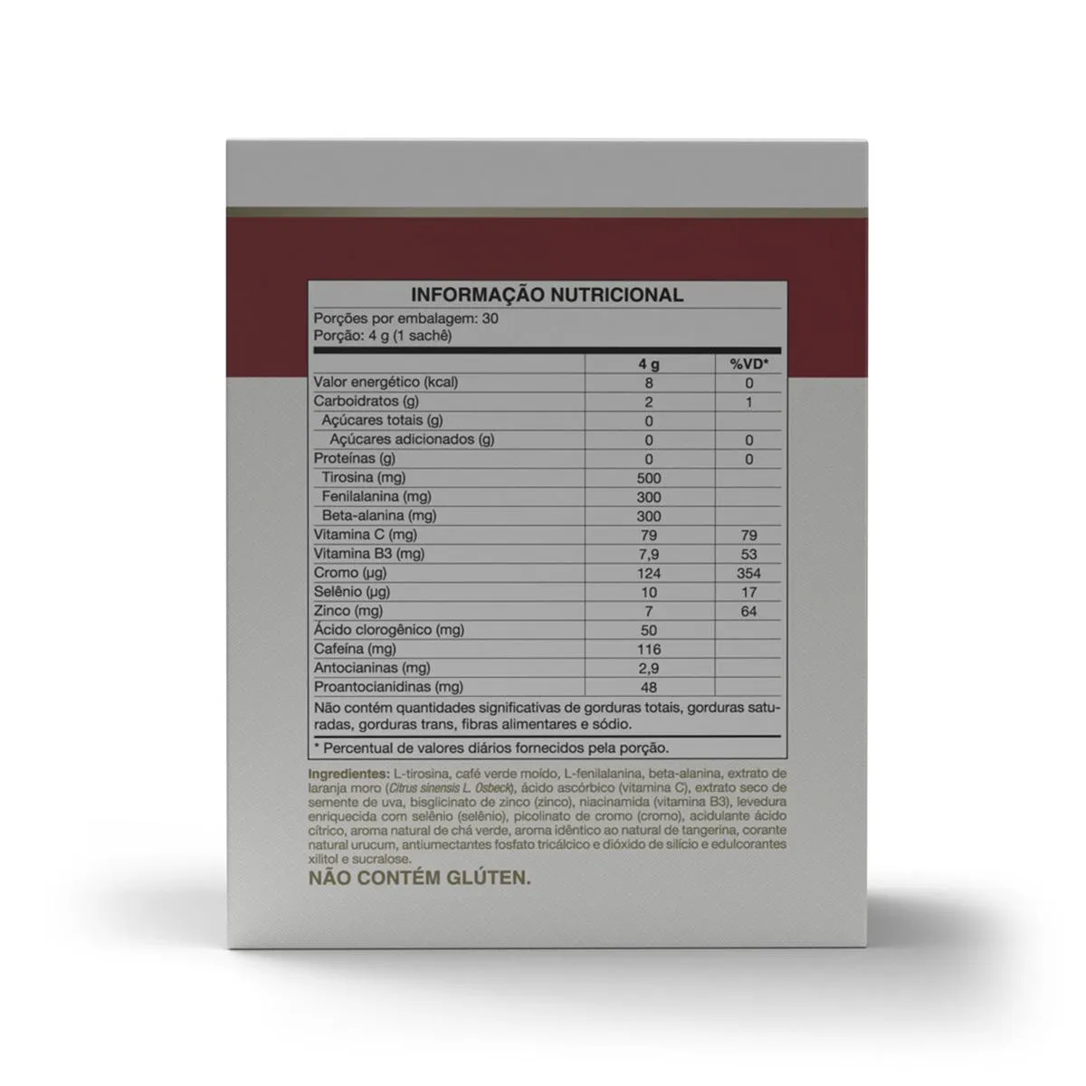 - Selo de Qualidade VLabor. Recomendação e modo de uso: Suplemento alimentar de uso adulto (a partir de 19 anos de idade): ingerir 1 sachê por dia, 1 hora antes das atividades físicas ou seguir a recomendação de um profissional da saúde. Ingredientes: Tirosina, café verde moído, fenilalanina, beta-alanina, extrato de laranja moro (Citrus sinensis L. Osbeck), ácido ascórbico (vitamina c), extrato seco de semente de uva, bisglicinato de zinco (zinco), niacinamida (vitamina B3), levedura enriquecida com selênio (selênio), picolinato de cromo (cromo), acidulante ácido cítrico, aroma natural de chá verde, aroma idêntico ao natural de tangerina, corante natural urucum, antiumectantes fosfato tricálcico e dióxido de silício e edulcorantes xilitol e sucralose. NÃO CONTÉM GLÚTEN. Cuidados e conservação: - Manter o produto bem fechado e conservar ao abrigo da luz, calor, odor e umidade.