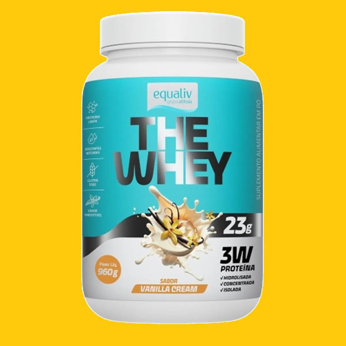- Abra um dos potes do kit de whey protein Equaliv Vanilla Cream.