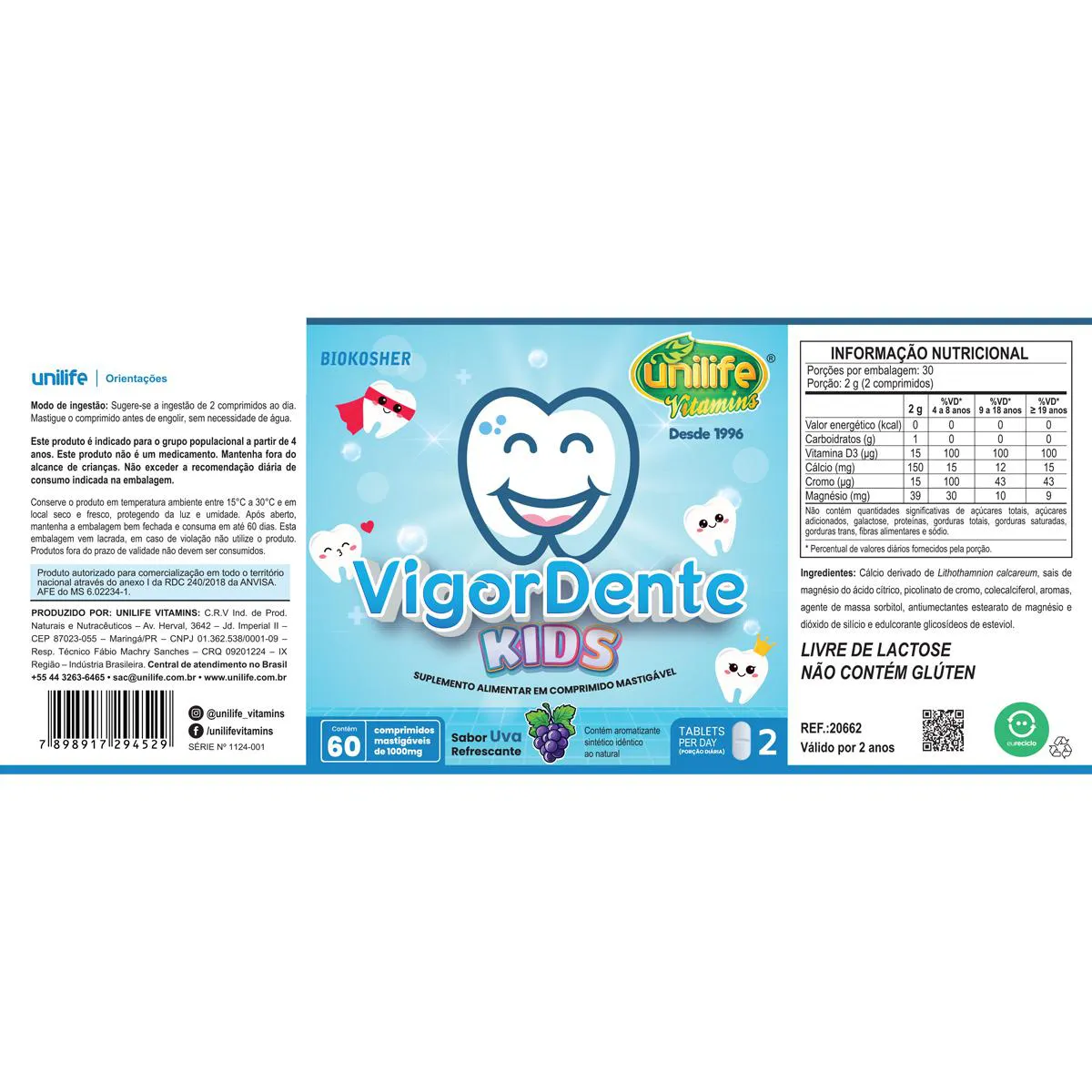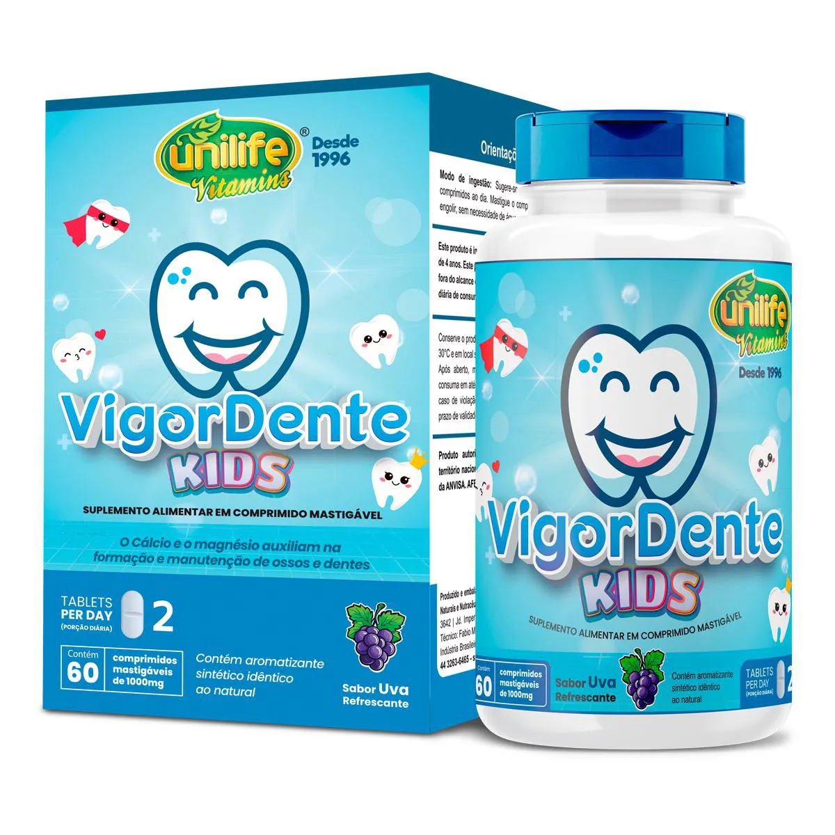 O Vigordente Kids é um suplemento mineral em comprimidos mastigáveis, elaborado com cálcio de origem vegetal, magnésio, cromo e vitamina D3, adoçado naturalmente com stévia e com sabor de uva. Destina-se a complementar a ingestão diária de minerais e vitaminas de forma prática e agradável para o público infantil, oferecendo nutrientes essenciais para o desenvolvimento e bem-estar.