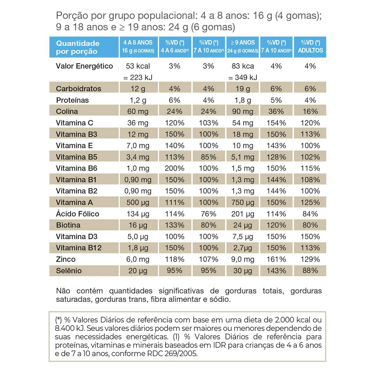 - Gomas em formato de ursinho. Ingredientes: Gelatina, água, suco de maçã concentrado, bitartarato de colina (colina), ácido ascórbico (vitamina c), pantotenato de cálcio (vitamina B5), nicotinamida (vitamina B3), acetato de DL-alfa-tocoferol (vitamine E), óxido de zinco (zinco), cianocobalamina (vitamina B12), colecalciferol (vitamina d), selenito de sódio (selênio), cloridrato de tiamina (vitamina B1), palmitato de retinol (vitamina A), cloridrato de piridoxina (vitamina B6), riboflavina (vitamina B2), L-metilfolato de cálcio (ácido fólico), biotina (biotina), agente de massa xarope de glicose e sorbitol, acidulantes: ácido cítrico e ácido lático, glaceantes: ágar, cera de carnaúba e óleo vegetal, aromatizantes naturais de groselha, uva e blueberry e corante antocianina. NÃO CONTÉM GLÚTEN.