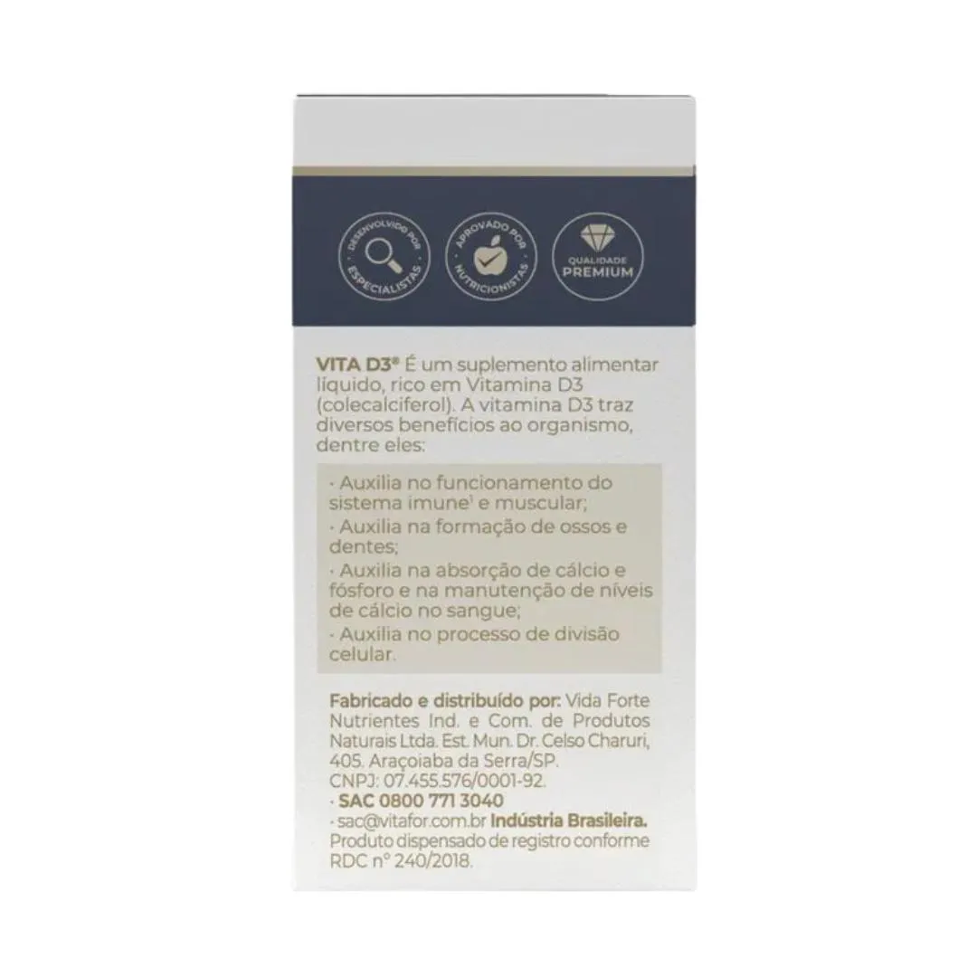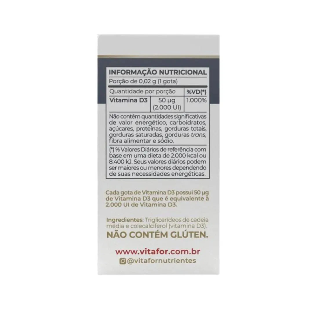 O Vita D3 Vitafor é um suplemento de vitamina D3 (colecalciferol) em gotas, com alta concentração de 2.000 UI por dose. É uma solução líquida desenvolvida para fornecer a suplementação adequada de vitamina d para o organismo.