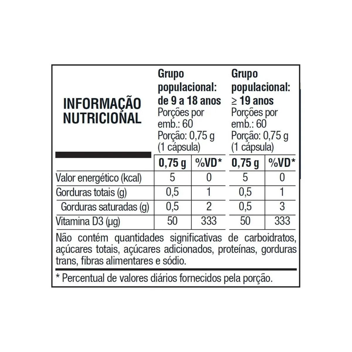 Ingredientes Triglicerídeos de cadeia média e colecalciferol (vitamina D3). Composição da cápsula: gelatina, água purificada e umectante glicerina. Não contém Glúten.