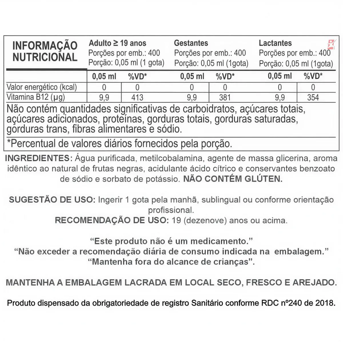 KIT COM 2 vitamina B12 METILCOBALAMINA VEGANA ALTO TEOR DE VITAMINA B12 APENAS 1 GOTA AO DIA 20ML 400 DOSES CADA – TOTAL: 40ML E 800 DOSES – APISNUTRI DESCRIÇÃO Essencial para o funcionamento do organismo humano, a vitamina B12 é produzida através de alimentos ingeridos na alimentação, como carne bovina, peixe, frutos do mar, ovos, leite e derivados. Também conhecida como cobalamina, a vitamina B12 possui 2 formas, a cianocobalamina, sua forma sintética que será convertida em metilcobalamina dentro do organismo; e a metilcobalamina, sua forma natural e mais biodisponível, pois assim que ingerida já será absorvida. Vitamina hidrossolúvel, a B12 é absorvida na última porção do intestino delgado e metabolizada pelo fígado, desempenhando funções primordiais à manutenção da vida dentro do organismo humano. BENEFÍCIOS - Apenas 1 gota ao dia ao dia; - 400 doses/porções por frasco, ALTO RENDIMENTO; - 800 doses/poções por KIT; - Produto vegano; - Sublingual; - 413% da IDR por gota para adultos; - 381% da IDR para gestantes; - 354% da IDR para lactantes; - Auxilia na formação das células vermelhas; - Auxilia no processo de divisão celular; - Auxilia no metabolismo energético dos carboidratos, proteínas, gorduras e da homocisteína; - Auxilia na formação dos neurônios; - Não contém Glúten, Açúcar e Lactose; - Sem corantes; - Não testado em animais; - Embalagem reciclável. SUGESTÃO DE USO Ingerir 1 gota pela manhã, sublingual ou conforme orientação profissional. RECOMENDAÇÃO DE USO: 19 (dezenove) anos ou acima. TABELA NUTRICIONAL -COMPOSIÇÃO & RECOMENÇÕES ANEXO NAS IMAGENS. DADOS TÉCNICOS Registro ANVISA – Produto de acordo com a RDC nº240 de 2018. Marca – Apisnutri. Conteúdo líquido total – 20ml. Rendimento líquido total – 400 doses/porções. Peso líquido total – 20g. Peso bruto total – 70g. Peso produto + embalagem (aproximado) – 150g. Código de barras (EAN) – 7899468511165. Dimensões do produto – altura 12 cm; largura 4,5 cm; comprimento 4,5 cm. Dimensões da embalagem padrão – altura 7 cm; largura 13 cm; comprimento 16cm. ITENS DO ANÚNCIO 2 Unidades do produto: VITAMINA B12 METILCOBALAMINA VEGANA ALTO TEOR DE VITAMINA B12 APENAS 1 GOTA AO DIA 20ML 400 DOSES CADA – APISNUTRI Total – 40ml e 800 DOSES POR KIT.
