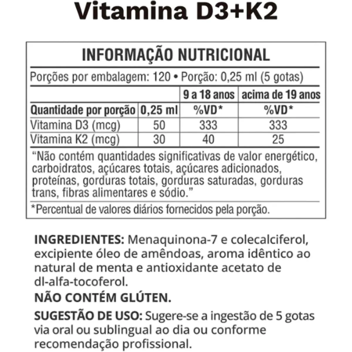É um suplemento em gotas que combina as vitaminas D3 e K2 em uma formulação prática e saborosa, desenvolvido para complementação nutricional. Apresentado em embalagem de 30ml com sabor de menta, o produto é vegano, livre de glúten e derivados de origem animal.