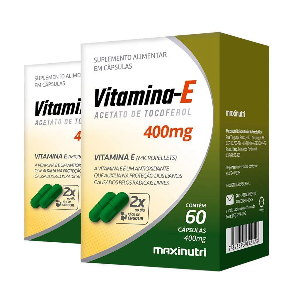 Kit 2 vitamina E 400mg Maxinutri 60 CápsulasDescubra a beleza natural da Vitamina E com nosso produto premium! Conhecida por suas propriedades antioxidantes, a Vitamina E é um poderoso aliado para cuidar da saúde da sua pele. Nossa fórmula exclusiva oferece nutrição profunda, ajudando a proteger contra os danos causados pelos radicais livres e promovendo uma aparência radiante e jovem. Experimente agora e eleve sua rotina de cuidados com a pele para o próximo nível, de forma natural e eficaz.A vitamina E é um nutriente essencial que desempenha um papel fundamental na saúde do corpo humano, atuando como um poderoso antioxidante. Ela é uma vitamina lipossolúvel, o que significa que se dissolve em gorduras e é armazenada no tecido adiposo do corpo.Modo de uso: Ingerir 2 cápsulas ao dia.Ingredientes: Vitamina E (micropellets de acetato de tocoferol) excipiente: silicato de magnésio, antiumectante: dióxido de silício, cápsula: gelatina e corantes: amarelo 10, amarelo 6, azorrubina, azul brilhante e dióxido de titânio.NÃO CONTÉM GLÚTEN.RDC: Dispensado de Registro