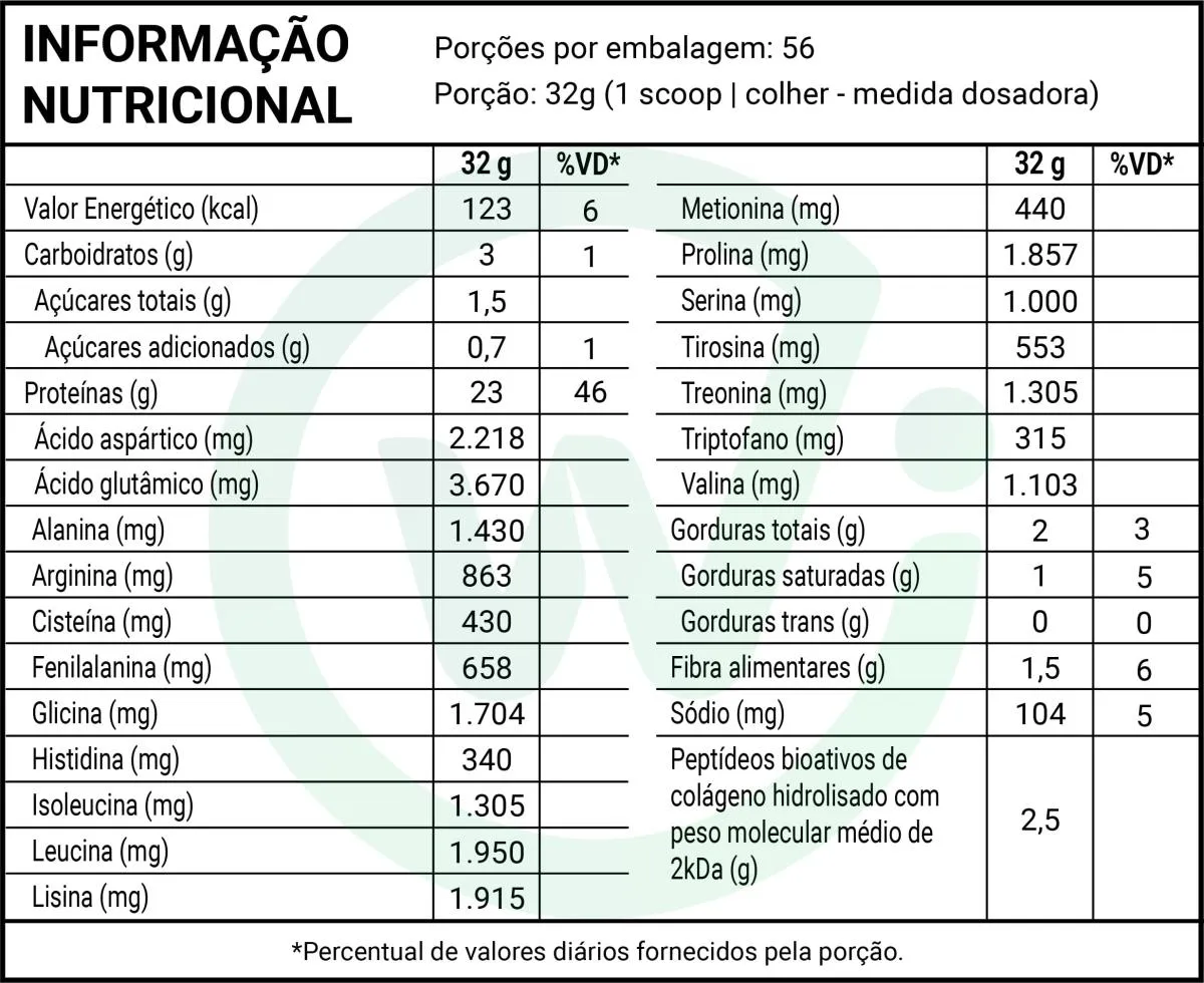 Oferece cerca de 23g de proteína por porção de 32g.Boa quantidade de BCAAs