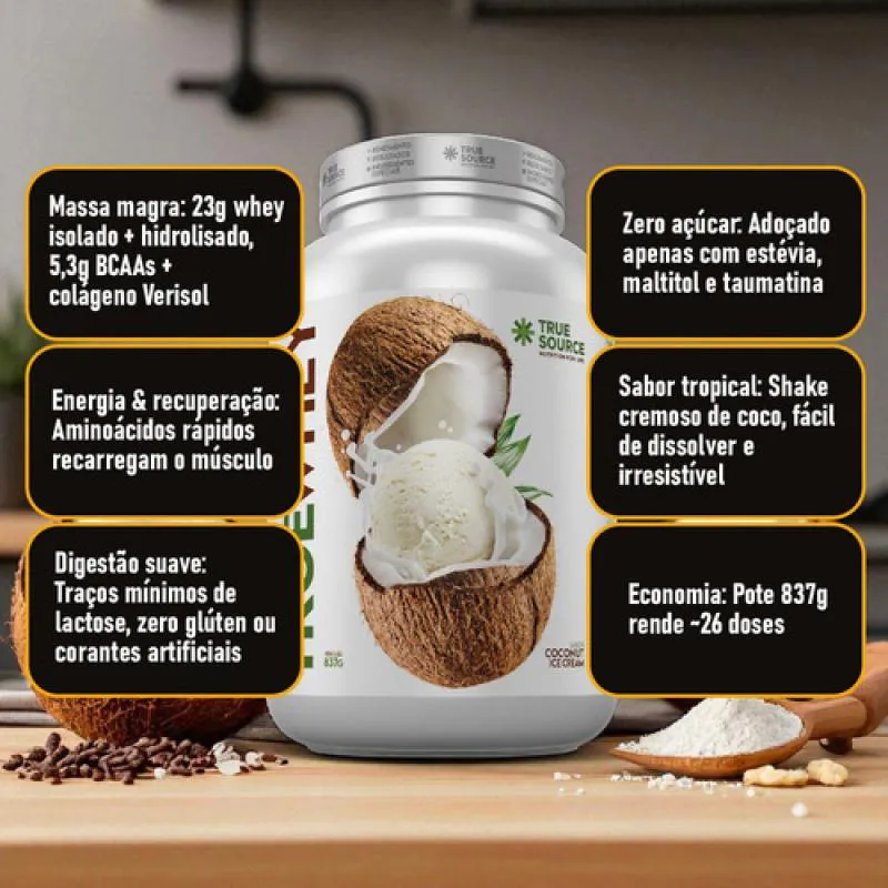 O True Whey Coconut Ice Cream 837 g da True Source é uma proteína em pó premium com sabor irresistível de sorvete de coco. Sua fórmula exclusiva combina proteínas hidrolisadas e isoladas do soro do leite, oferecendo 23 g de proteína por dose, além de 5,3 g de BCAAs e 2,5 g de colágeno Verisol®.⁣ Ideal para quem busca alta saciedade, suporte à recuperação muscular e benefícios estéticos, sem adição de adoçantes artificiais ou corantes.