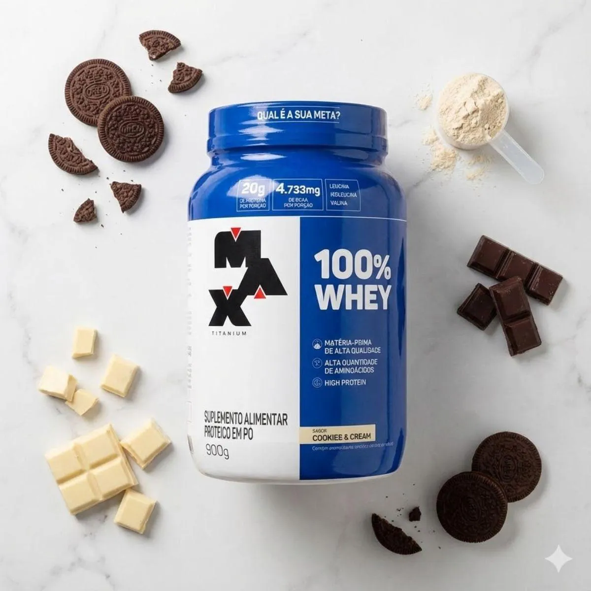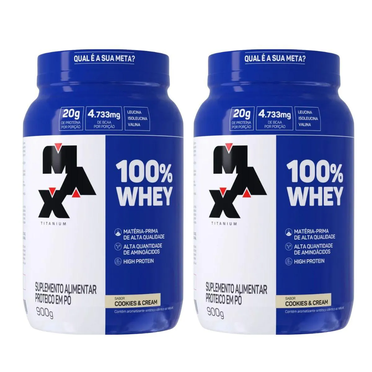shakes mais cremosos e receitas proteicas, adaptando se facilmente às preferências pessoais. O kit contém 2 embalagens de 900g cada, suplemento em pó, whey protein 100% concentrado, sabor Cookies & Cream, com cerca de 20g de proteína por porção. Produto de marca reconhecida pela qualidade, indicado para uso diário conforme as necessidades individuais, inclusive para quem procura whey protein 100% concentrado 20g de proteina com ótimo custo benefício. Aproveite o estoque limitado e garanta agora o Kit 2 Whey Protein 100% Concentrado Cookies & Cream Max Titanium para manter sua rotina mais prática e completa.