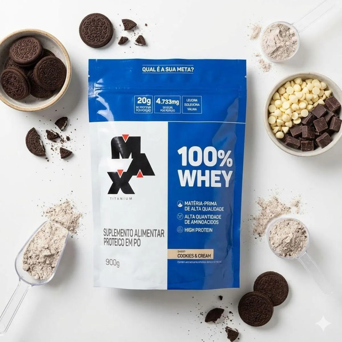 bem estar e praticidade. O preparo é simples: dilua uma porção em água ou leite, utilizando coqueteleira ou liquidificador. Também pode ser utilizado em vitaminas e receitas rápidas, adaptando se facilmente às preferências pessoais e à rotina alimentar.O kit contém 2 embalagens refil de 900g cada, suplemento em pó, whey protein 100% concentrado, sabor cookies & cream, com cerca de 21g de proteína por porção. Produto indicado para uso diário conforme as necessidades individuais, inclusive para quem procura whey protein 100% concentrado 21g de proteina com excelente custo benefício. Aproveite o estoque limitado e garanta agora o Kit 2 Whey Protein 100% Concentrado Cookies & Cream Max Titanium para manter sua rotina sempre completa e organizada.