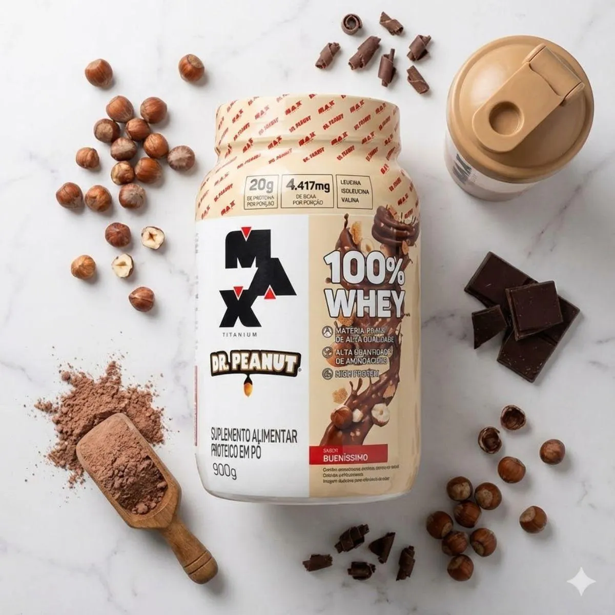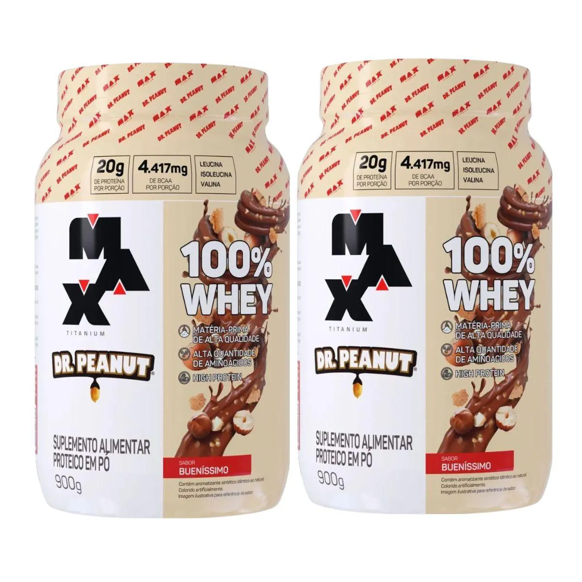 shakes, misturando uma porção em água, leite ou bebida de preferência, utilizando coqueteleira ou liquidificador. Também pode ser incluído em vitaminas, cremes proteicos e receitas, adaptando se facilmente ao dia a dia e permitindo variar o cardápio de forma prática. O kit contém 2 embalagens de 900g cada, suplemento em pó, whey protein concentrado, sabor Bueníssimo, com cerca de 20g de proteína por porção. Produto indicado para uso diário conforme as necessidades individuais, inclusive para quem procura whey protein dr peanut 20g de proteina com ótimo custo benefício. Aproveite o estoque limitado e garanta agora o Kit 2 Whey Protein Dr Peanut Bueníssimo Max Titanium para deixar sua rotina ainda mais saborosa e completa.