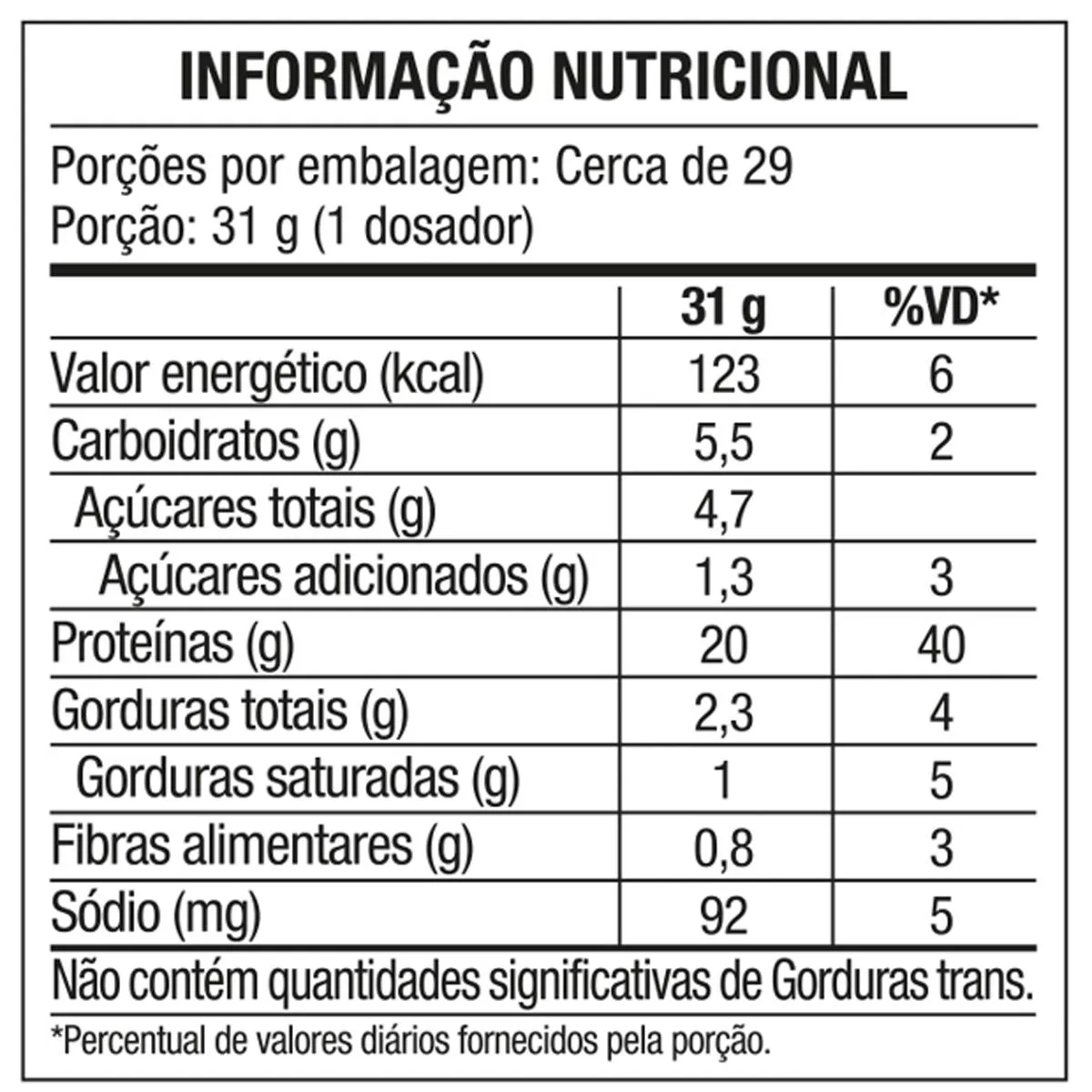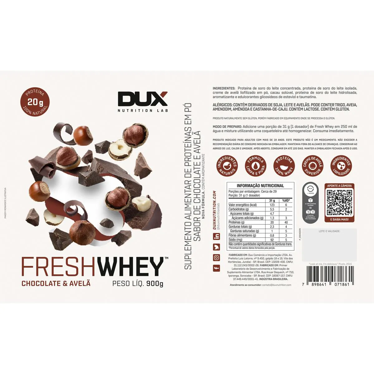 Ingredientes: proteína de soro do leite concentrada, proteína de soro do leite isolada, pasta de avelã liofilizada, cacau solúvel, proteína de soro do leite hidrolisada, edulcorantes glicosídeos de esteviol de stevia rebaudiana bertoni e taumatina e aromatizante natural. alérgicos: contém derivados de soja, leite e avelãs. pode conter trigo, aveia, amendoim, amêndoa, castanha-de-caju, castanha-do-pará e pistaches. contém lactose. contém glúten. modo de consumo: consumir até 2 porções (62 g) ao dia. modo de conservação: conservar ao abrigo de luz, calor e umidade. após aberto, consumir em até 120 dias. manter a embalagem fechada após o uso. modo de preparo: adicione uma porção de 1 dosador (31 g) de fresh whey em 250 ml de água e misture.