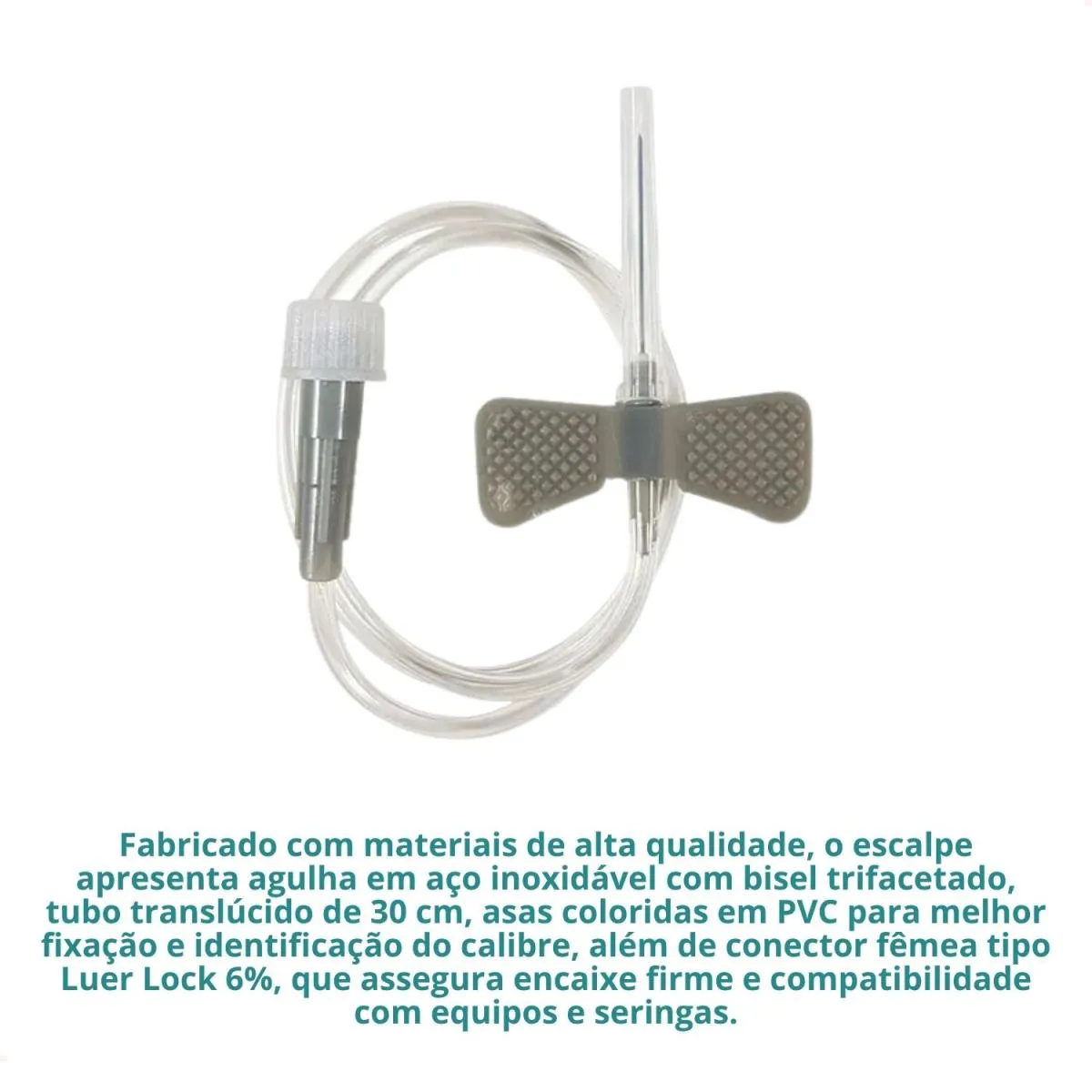 Fabricado com materiais de alta qualidade, o escalpe apresenta agulha em aço inoxidável com bisel trifacetado, tubo translúcido de 30 cm, asas coloridas em PVC para melhor fixação e identificação do calibre, além de conector fêmea tipo Luer Lock 6%, que assegura encaixe firme e compatibilidade com equipos e seringas.