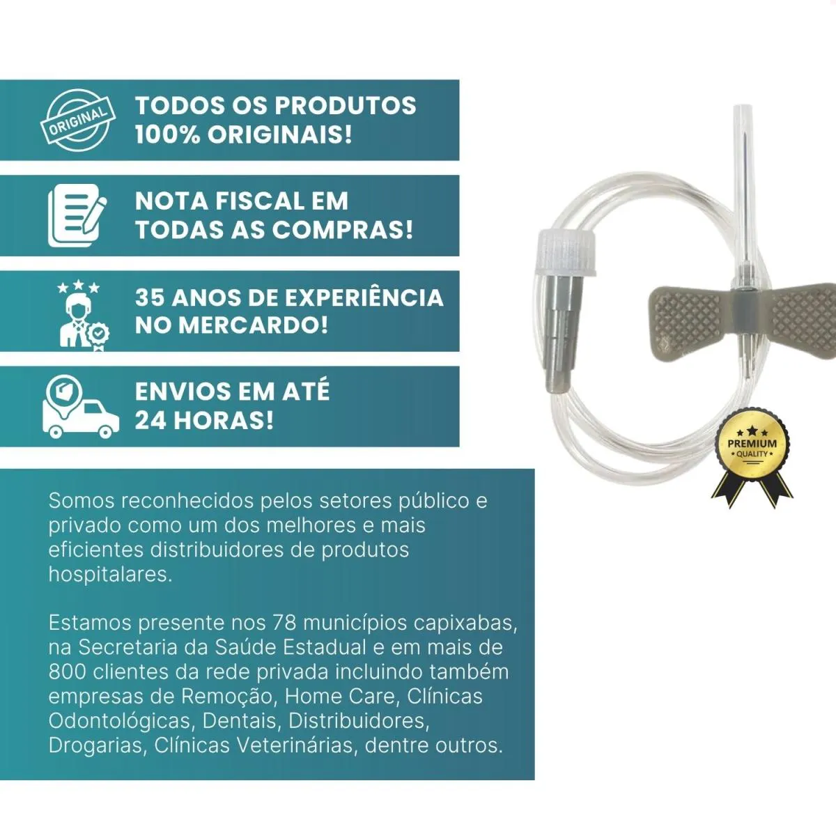 Desde 1990 atuamos com foco em licitações públicas para atendimento a hospitais e clínicas médicas do ES. Somos reconhecidos pelos setores público e privado como um dos melhores e mais eficientes distribuidores de produtos hospitalares, afinal, estamos presentes nos 78 municípios capixabas, na Secretaria da Saúde Estadual e em mais de 800 clientes da rede privada, incluindo também empresas de Remoção, Home Care, Clínicas Odontológicas, Dentais, Distribuidores, Drogarias, Clínicas Veterinárias, dentre outros.