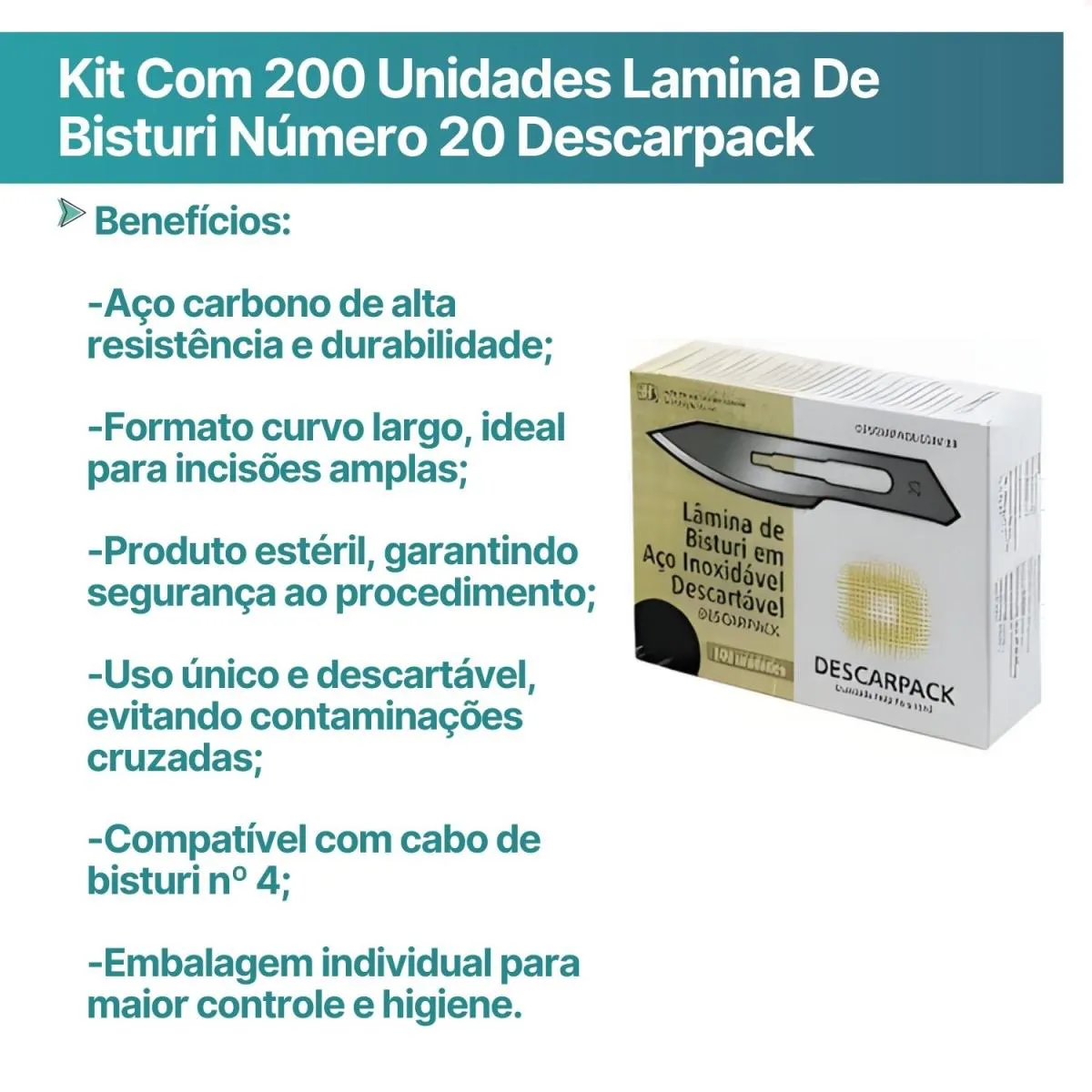 A Lâmina de Bisturi Descartável Nº 20 Descarpack é fabricada em aço Inox de alta resistência, proporcionando cortes precisos, seguros e eficientes em procedimentos médicos e cirúrgicos. Possui formato curvo largo, ideal para incisões amplas e contínuas, atendendo às exigências de procedimentos de média e grande complexidade.