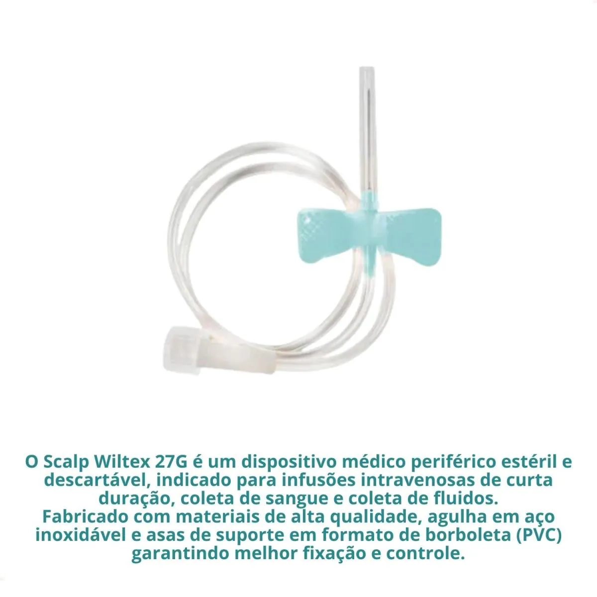 O Scalp Wiltex 27G é um dispositivo médico periférico estéril e descartável, indicado para infusões intravenosas de curta duração, coleta de sangue e coleta de fluidos.
