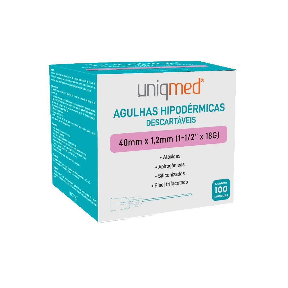 Agulhas Hipodérmicas Uniqmed As agulhas hipodérmicas Uniqmed 40x1,2mm são projetadas para procedimentos de administração subcutânea e intramuscular com precisão e conforto. Proporcionam uma aplicação suave e segura, reduzindo o desconforto para os pacientes e otimizando a eficiência para profissionais de saúde. Fabricadas em aço inoxidável de alta qualidade, garantem resistência à corrosão e durabilidade superior. O design com bisel tripla facilita a inserção na pele, minimizando o trauma durante a administração de medicamentos. Benefícios: