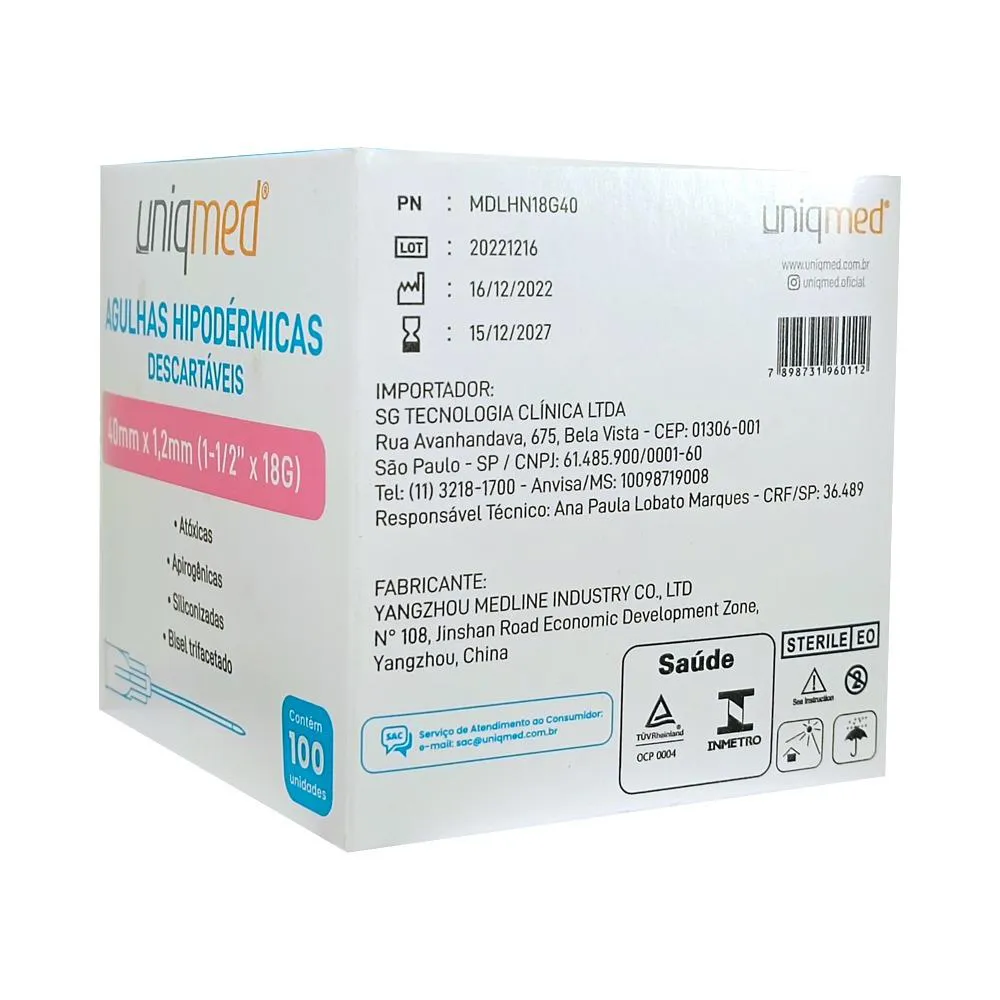 Kit 200Un Agulha Hipodermica 40X1,2Mm Uniqmed