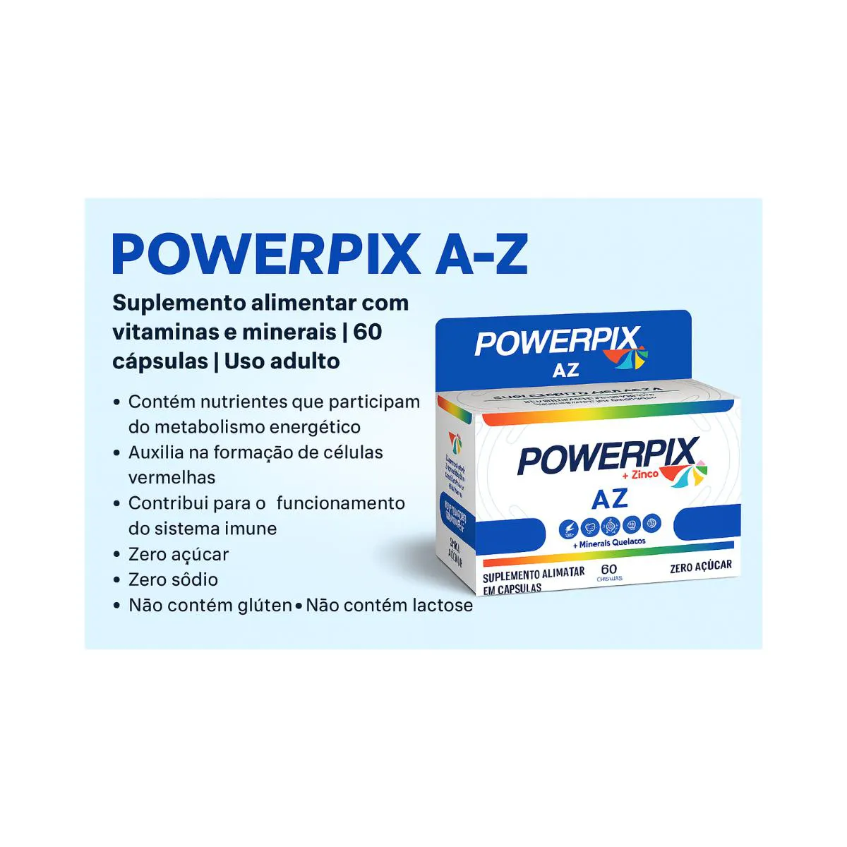 Suplemento alimentar com vitaminas e minerais | 60 cápsulas | Uso adulto PowerPix A-Z é um suplemento alimentar em cápsulas, formulado com vitaminas e minerais que desempenham funções importantes no organismo. Sua formulação completa oferece suporte nutricional diário para adultos, com nutrientes que participam de processos metabólicos, ajudam na proteção das células contra os radicais livres e contribuem para o funcionamento do sistema imune.