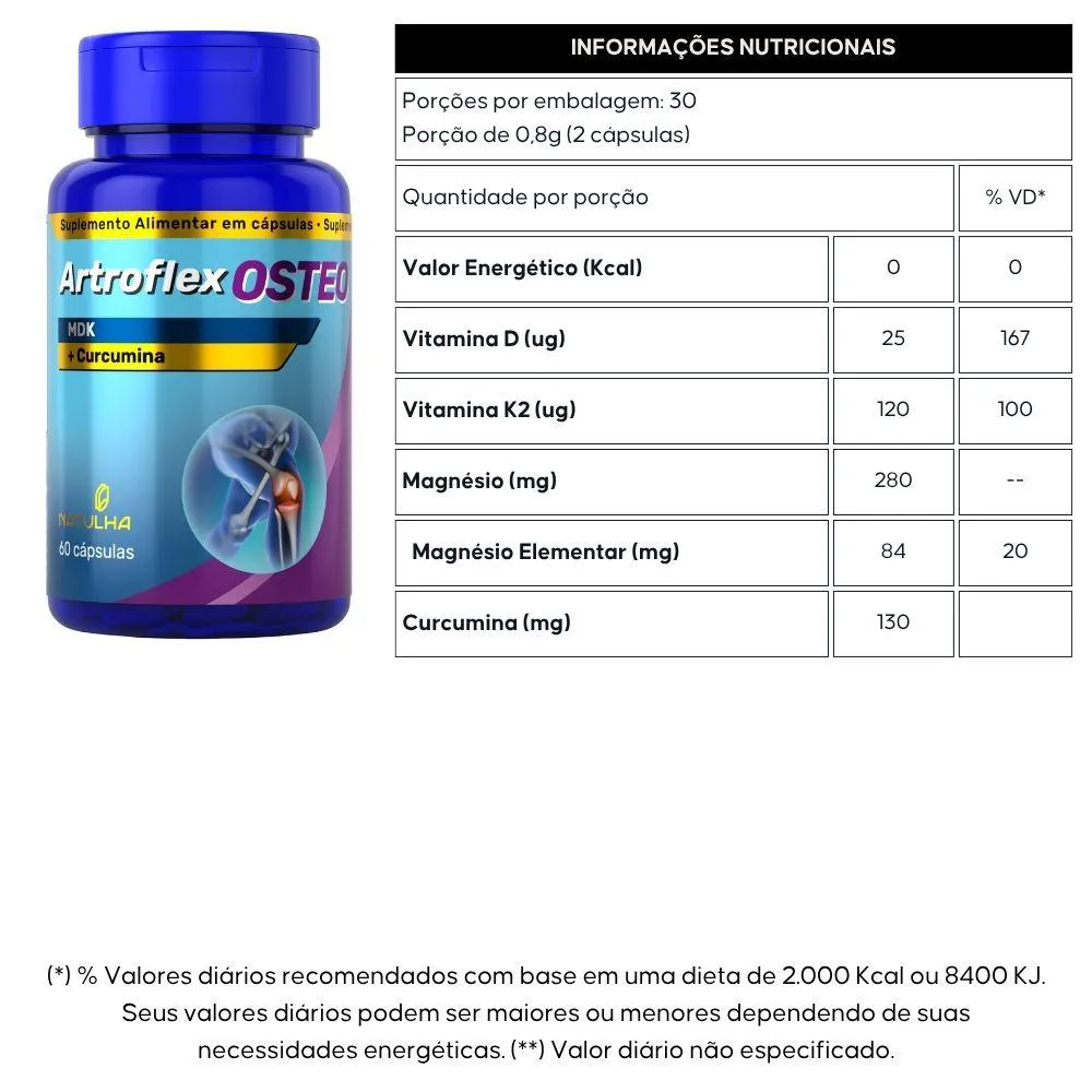 KIT com 2 unidades de Artroflex OSTEO ( Curcumina, Magnésio, vitamina D3 e k2) da marca Natulha com 60 cápsulas cada.