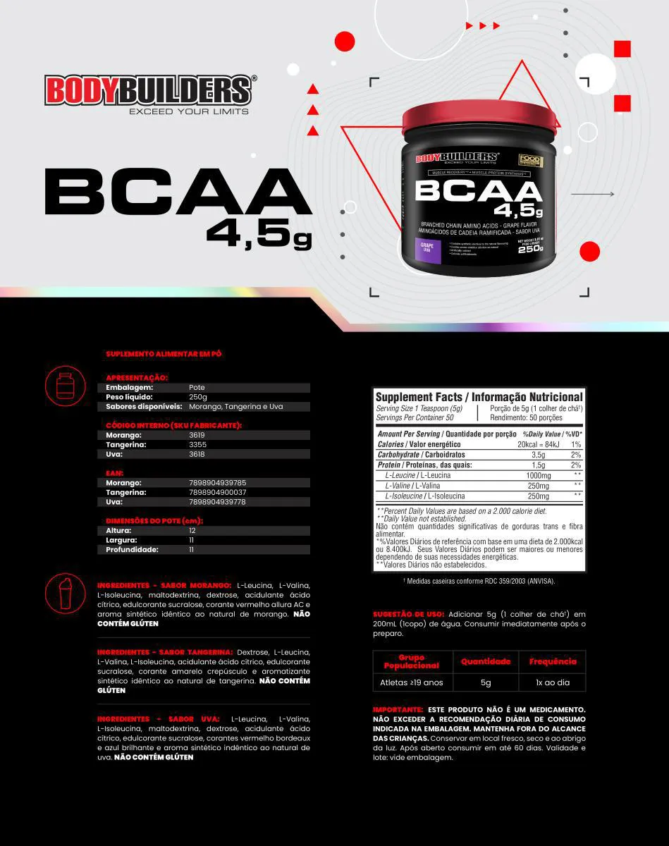 Indispensável para a manutenção e o crescimento dos músculos. Fornece 4,5g de aminoácidos de cadeia ramificada por dose. Promove uma maior recuperação muscular e aumento da resistência no pré e pós-treino, fornecendo um maior efeito anti-catabólico sendo um importante suplemento alimentar para ganhos de massa e recuperação muscular.