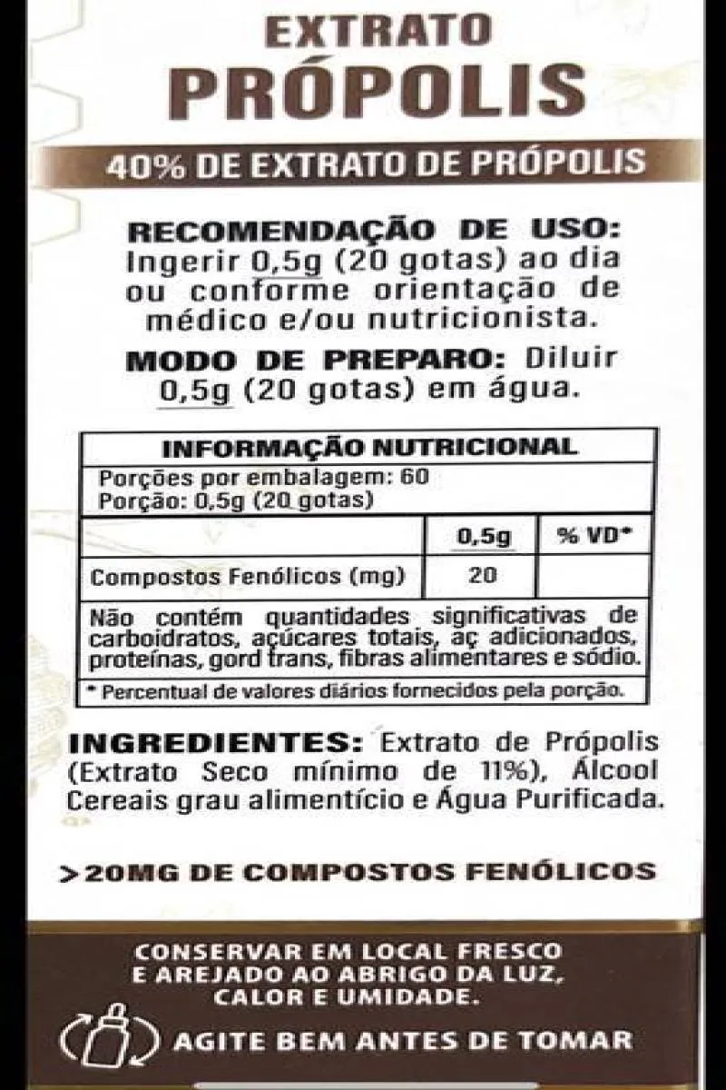 O produto é um extrato de própolis concentrado, composto por extrato seco mínimo de 11%, álcool de cereais grau alimentício e água purificada. Não contém glúten.