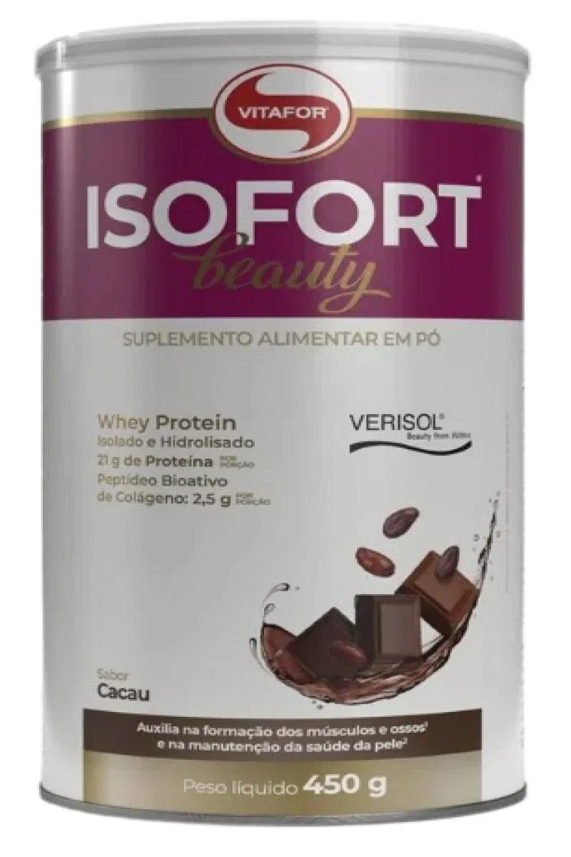 O Isofort Beauty whey protein Cacau Vitafor 450g é a combinação inteligente de proteínas de alta digestibilidade e absorção, além de conter Peptídeos Bioativos de colágeno - Verisol®.
