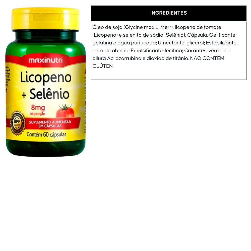 Óleo de soja (Glycine max L. Merr), licopeno de tomate (Licopeno) e selenito de sódio (Selênio); Cápsula: Gelificante: gelatina e água purificada; Umectante: glicerol; Estabilizante: cera de abelha; Emulsificante: lecitina; Corantes: vermelho allura Ac, azorrubina e dióxido de titânio. NÃO CONTÉM GLÚTEN