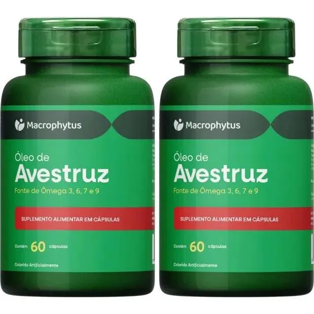 KIT com 2 unidades de Óleo de Avestruz 780mg (Ômega 3, 6, 7 e 9) da marca Macrophytus com 60 cápsulas cada.Uma nutrição equilibrada tem um papel muito importante na qualidade de vida. Com o ritmo acelerado de muitas pessoas, às vezes, é muito difícil prestar atenção a todos os requisitos que o corpo precisa para estar saudável e forte. Neste sentido, os suplementos cumprem a função de complementar a alimentação e ajudam a obter as vitaminas, minerais, proteínas e outros componentes indispensáveis para o correto funcionamento do organismo.COMO TOMARSugere-se a ingestão de até 6 (seis) cápsulas deste produto ao dia, preferencialmente junto das principais refeições, ou de acordo com orientação profissional.TABELA NUTRICIONALporção de 4,68g (6 cápsulas)Porção por embalagem: 10Valor Energético 27 kcal 1%Gorduras Totais, das quais 5g 8%Gorduras Saturadas 1g 5%Gorduras monoinsaturadas 1g 5%Gorduras poli-insaturadas 1g 5%Ácido Alfa Linolênico (Ômega 3) 98mg 2%Ácido Linoleico (Ômega 6) 457mg 2%Ácido Palmitoléico (Ômega 7) 618mg **Ácido Oléico (Ômega 9) 950mg **Alquigliceróis 214mg **INGREDIENTESÓleo avestruz (Struthio camelus). Composição da cápsula: Gelatina, água purificada e umectante de glicerina, dióxido de titânio (INS171) e amarelo tartrazina (102). NÃO CONTÉM GLÚTEN. NÃO CONTÉM LACTOSE. CONTÉM AMARELO TARTRAZINA.ALÉRGICOS: PODE CONTER DERIVADOS DE SOJA.ANVISA:"Produto indicado para maiores de 19 anos""Este produto não é um medicamento.""Não exceder a recomendação diária de consumo indicada na embalagem.""Mantenha fora do alcance de crianças.""Este produto não deve ser consumido por gestantes, lactantes e crianças.""Produto dispensado de registro conforme RDC 240/2018."