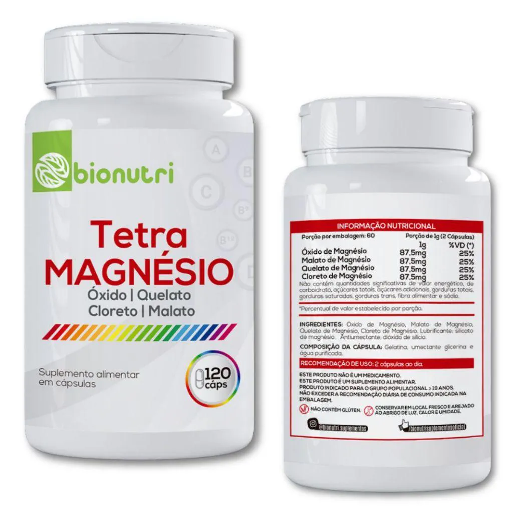 Tetra Magnésio Bionutri – 240 cápsulas | 4 formas de Magnésio para saúde completa Potencialize sua saúde com o Tetra Magnésio da Bionutri, um suplemento alimentar de alta qualidade que combina 4 formas altamente biodisponíveis de magnésio em uma fórmula exclusiva. Ideal para quem busca mais energia, foco, relaxamento muscular, equilíbrio mental e imunidade no dia a dia. Benefícios principais: • Aumenta o foco, a memória e a concentração • Atua na recuperação muscular e prevenção de câimbras • Contribui para a saúde cardiovascular e neuromuscular • Auxilia na produção de energia e redução da fadiga • Reduz o estresse e promove o relaxamento Composição – 4 formas de Magnésio em 1 cápsula: • Magnésio Óxido – Auxilia nas funções Nervosas e Musculares;. • Magnésio Quelato – Apoio ao sistema muscular redução da fadiga e câimbras. • Magnésio Malato – Contribui para a produção de energia e vitalidade. • Magnésio Cloreto – Melhora a absorção intestinal e hidratação celular. 2 Frascos (240 Cápsulas) Recomendação de uso: Consumir 2 cápsulas ao dia, preferencialmente junto às refeições ou conforme orientação de um profissional de saúde. Por que escolher o Tetra Magnésio Bionutri? • Fórmula avançada com 4 formas ativas • Alta absorção e biodisponibilidade • Produto livre de glúten e lactose • Fabricado com rigoroso controle de qualidade • Ideal para uso contínuo e seguro Invista no seu bem-estar físico e mental com o Tetra Magnésio Bionutri – o suplemento completo para quem busca mais equilíbrio, energia e saúde todos os dias. Produto com envio rápido e garantia de qualidade.