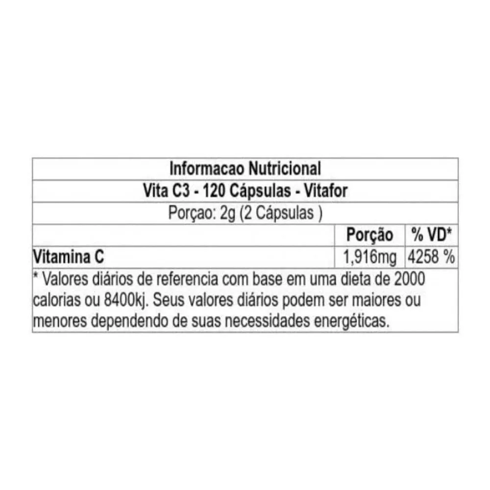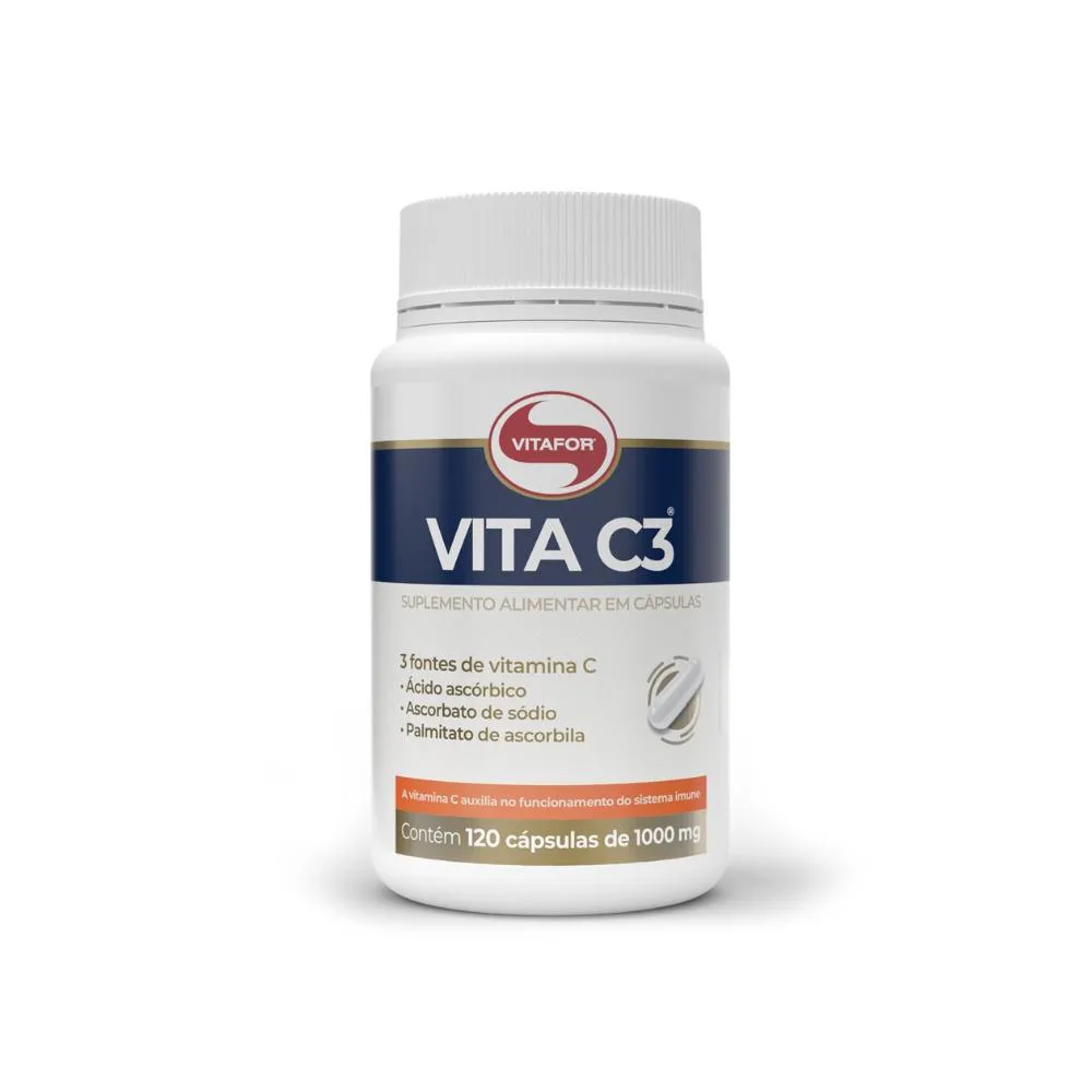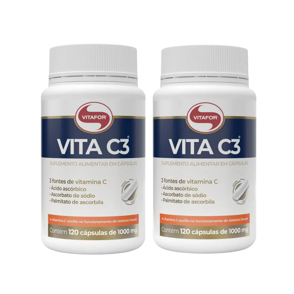 A VITA C3 ® Vitafor é um suplemento alimentar em cápsulas a base de vitamina c, excelente antioxidante, além de fortalecer o sistema imunológico. Imunidade para uma vida mais forte Cansaço, imunidade baixa, irritabilidade, podem ser sinais da falta de vitamina C. Pela relação da vitamina C com outros processos do corpo, uma queda de cabelo pode ser associada a essa vitamina, pois ela ajuda na formação do colágeno que compõe pele, cabelo, unhas e articulações. Outro problema que pode estar relacionado a deficiência de vitamina C é a anemia. Apesar de uma das causas da doença ser a deficiência de ferro, a vitamina C cumpre a importante função da absorção do ferro, assim, mesmo com ingestão do ferro é possível que ele não seja absorvido pela falta de vitamina e assim ocasionar anemia. A suplementação é uma forma de complementar a necessidade diária de vitamina C. Essa vitamina é necessária em todas as fases da vida A VITA C3 ® Vitafor é um suplemento alimentar em cápsulas a base de Vitamina C, excelente antioxidante, além de fortalecer o sistema imunológico. VITA C3 ® é altamente concentrada em 3 diferentes fontes de Vitamina C- ácido ascórbico, ascorbato de sódio, palmitato de ascorbila. Essa combinação contribui para melhor aproveitamento dos nutrientes pelo organismo Benefícios do consumo: