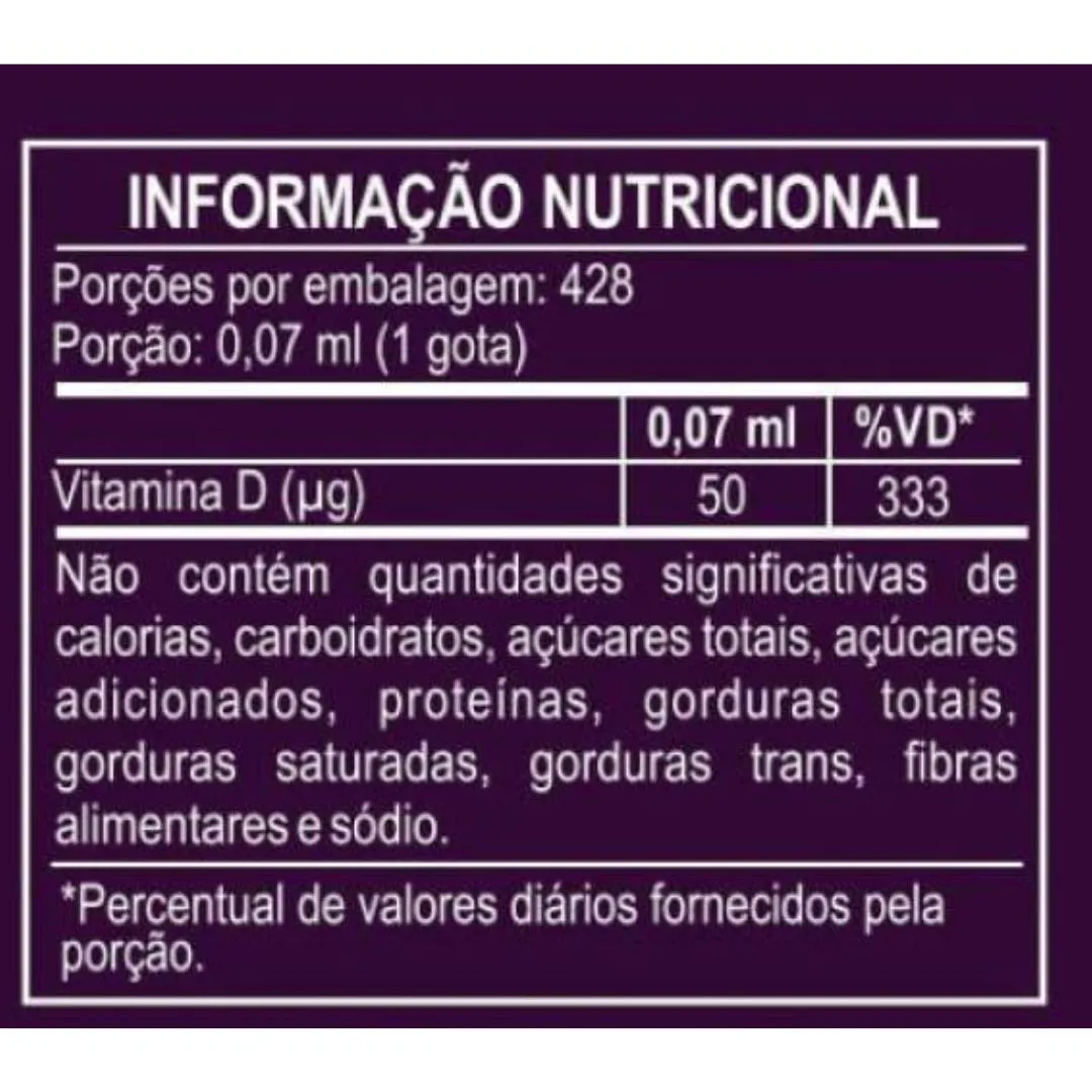 INGREDIENTES: Colecalciferol. Veículo: Oleo de girassol, aroma idêntico ao natural de frutas vermelhas e antioxidante acetato de DL-alfa-tocoferol. ALÉRGICOS: PODE CONTER DERIVADOS DE SOJA, PEIXE, CRUSTÁCEOS (CARANGUEJO), AMENDOIM, AMENDOA, AVELÃ, CASTANHA DE CAJU, CASTANHA DO BRASIL, MACADAMIAS, NOZES, PISTACHE E CASTANHAS. NÃO CONTÉM GLÚTEN. RECOMENDAÇÃO DE USO: Ingerir 1 (uma) gota ao dia ou segundo orientação de profissional habilitado. Produto recomendado para o grupo populacional ≥ 19 anos. CONSERVAÇAO & ADVERTENCIA: Conservar ao abrigo da luz, calor e umidade. Manter em local limpo e fresco. Após aberto, consumir preferencialmente até o fim da validade do produto, desde que conservado adequadamente. NÃO EXCEDER A RECOMENDAÇÃO DIÁRIA DE CONSUMO INDICADA NA EMBALAGEM. ESTE PRODUTO NÃO É UM MEDICAMENTO. MANTENHA FORA DO ALCANCE DE CRIANÇAS.