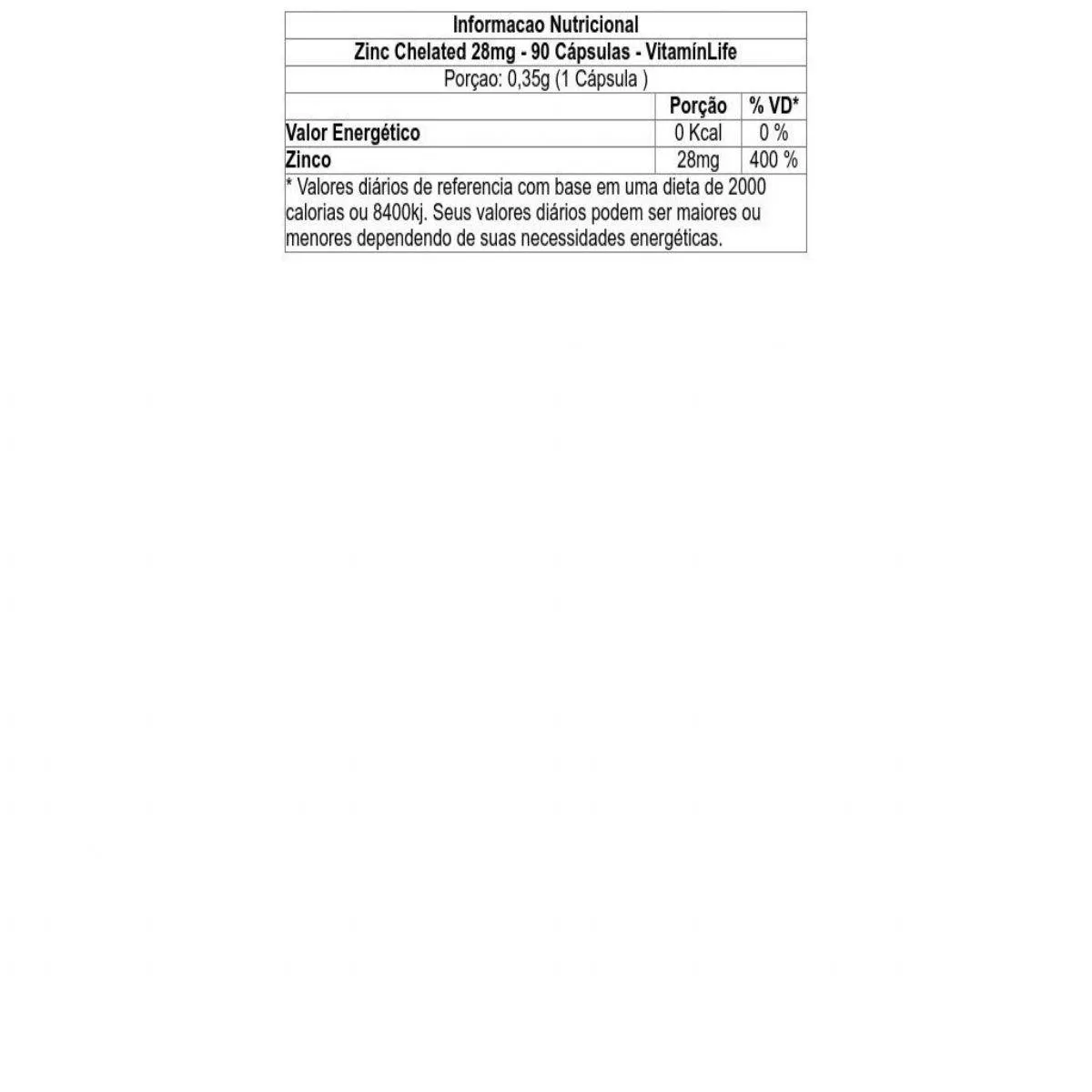 Ingredientes - Zinc Chelated 28mg - 90 Cápsulas - VitamínLife