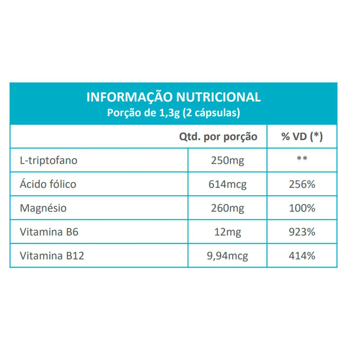 L-triptofano, ácido fólico, magnésio, vitamina B6, vitamina B12, excipiente: silicato de magnésio, antiumectante: dióxido de silício, cápsula: gelatina e corantes: dióxido de titânio, azorrubina, vermelho 40, amarelo 6 e azul brilhante.