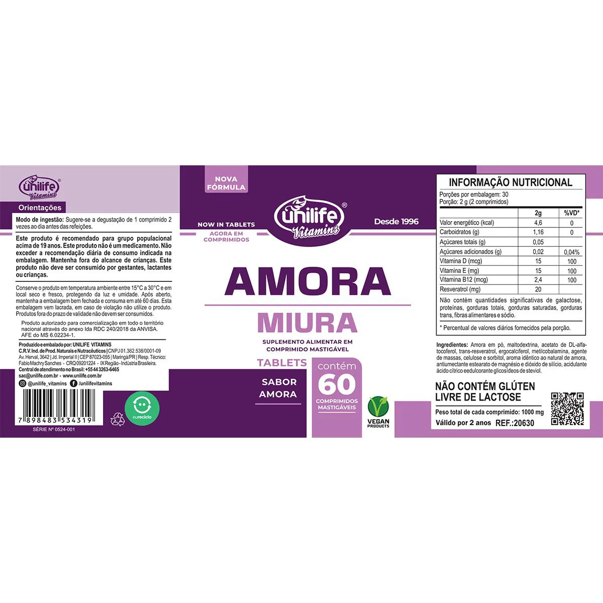 Kit 3 Amora Miura Unilife 60 Comprimidos O suplemento nutricional Amora Miura em comprimidos da Unilife oferece uma gama ampla de benefícios. A conveniência em formato de comprimidos torna fácil a inclusão deste poderoso suplemento na sua rotina diária. Sugere-se a ingestão de 1 comprimido 2 vezes ao dia, após as principais refeições. Ingerir com líquido. NÃO CONTÉM GLÚTEN. LIVRE DE LACTOSE. PRODUTO VEGANO. Ingredientes: Amora em pó, maltodextrina, acetato de DL-Alfa-Tocoferol, trans-resveratrol, ergocalciferol, metilcobalamina, agente de massa (celulose e sorbitol), aroma idêntico ao natural de amora, antiumectantes estearato de magnésio e dióxido de silício, acidulante ácido cítrico e edulcorante glicosídeos de steviol. Produto autorizado para comercialização em todo o território nacional através do anexo I da RDC 240/2018 da ANVISA. AFE do MS 6.02234-1.