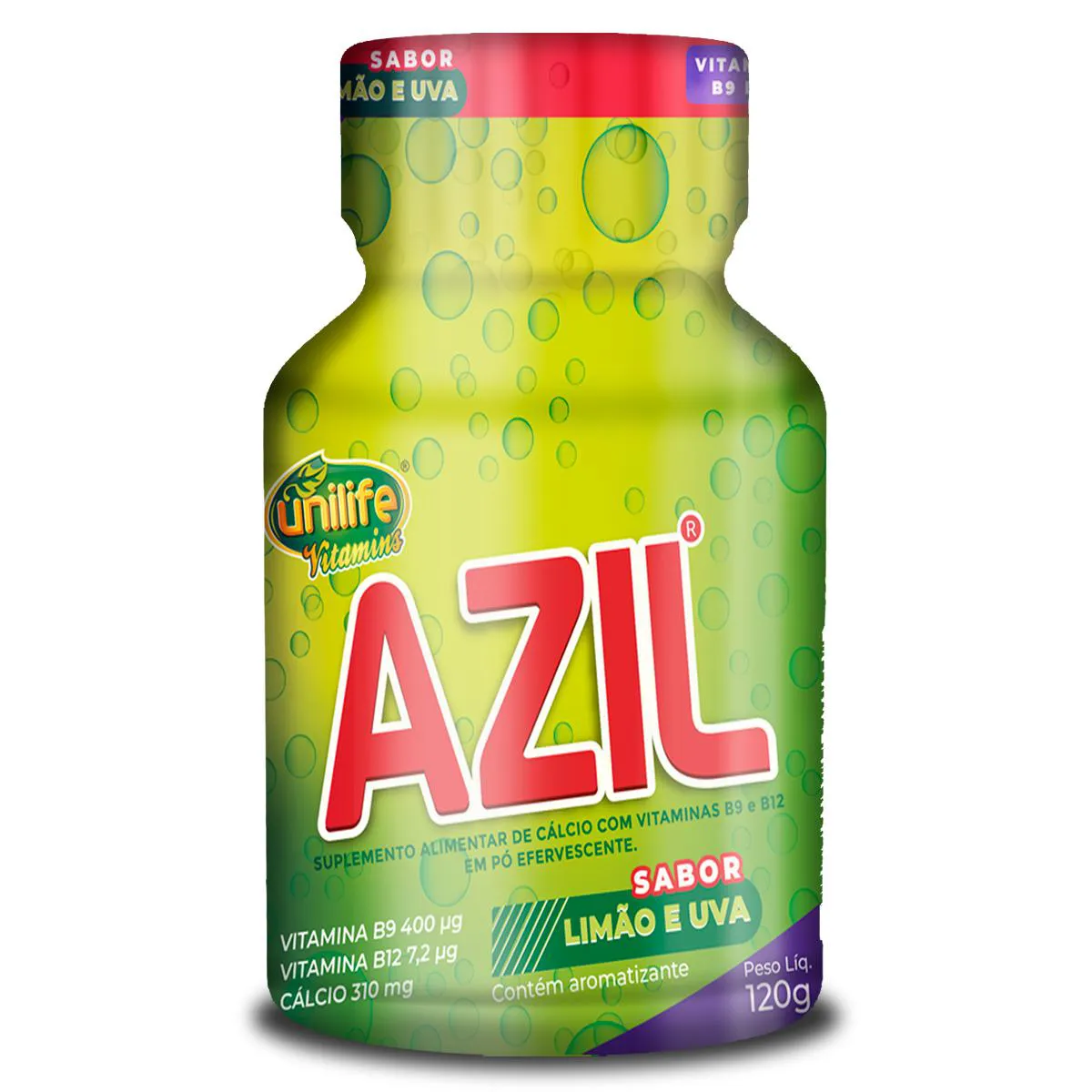O Azil Efervescente é um suplemento alimentar em forma de sal de frutas, com sabores de limão e uva, que fornece Cálcio e Vitaminas B9 e B12, com ação alcalina. Serve para auxiliar quando se come algo que não caiu bem, ajudando a equilibrar o organismo e oferecendo uma opção saudável de suplementação, sem adição de sacarina sódica.