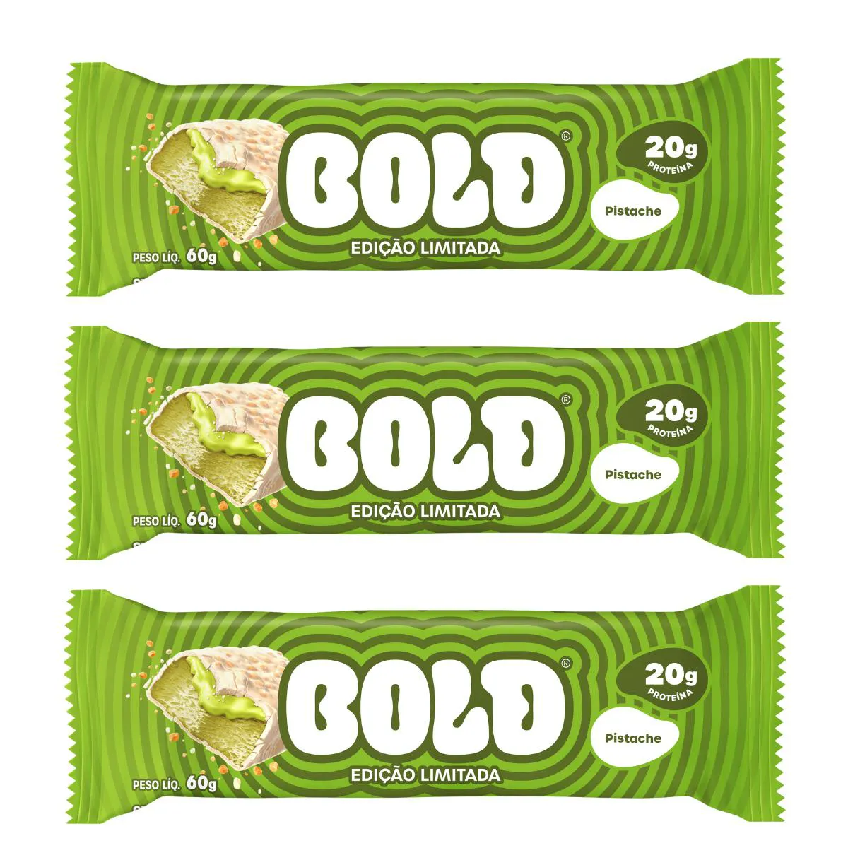 Kit com 3 barras de proteína Sabor Pistache 60g – Bold O Kit com 3 Barras de Proteína Sabor Pistache 60g da Bold combina sabor,