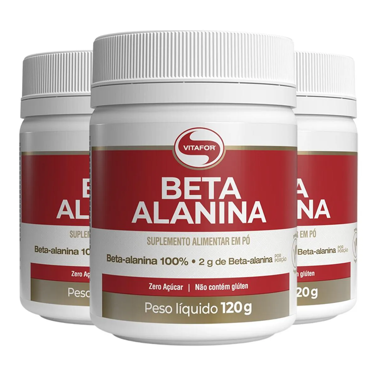 Kit 3 Beta Alanina Vitafor Vegano 120g Beta-Alanina é um suplemento alimentar em pó ou cápsulas, que contém alta concentração do aminoácido beta-alanina. Diferenciais: - 100% Beta-Alanina.