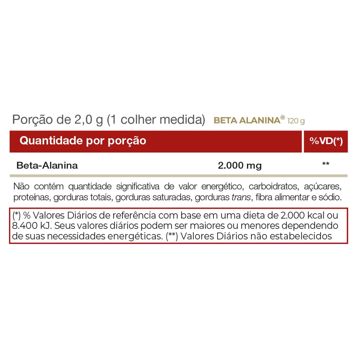 QUANTIDADE DIÁRIA MÁXIMA DE 2 g COM DOSES DIVIDIDAS DE, NO MÁXIMO, 300 mg, COM INTERVALO DE DUAS HORAS ENTRE AS DOSES. CADA PORÇÃO DE 50mL DO PRODUTO PRONTO PARA O CONSUMO CONTÉM QUANTIDADE APROXIMADA, NÃO SUPERIOR À 286mg DE BETA-ALANINA. Ingredientes: Beta-alanina e antiumectante dióxido de silício. NÃO CONTÉM GLÚTEN. Cuidados e conservação: - Manter o produto bem fechado e conservar ao abrigo da luz, calor, odor e umidade.