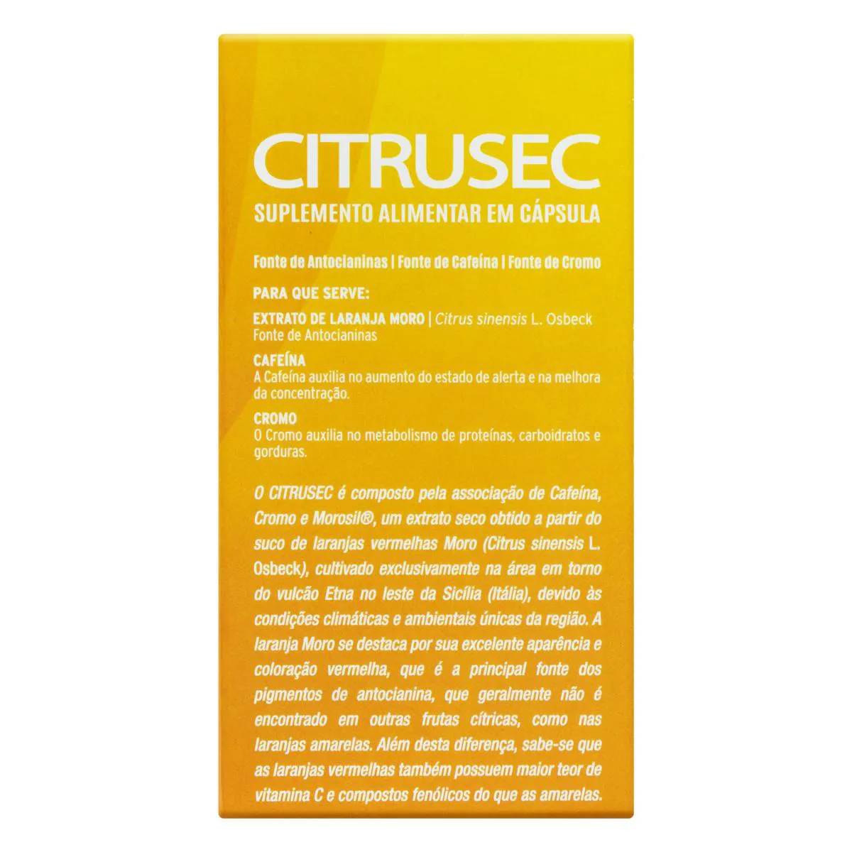 O Citrusec é um suplemento alimentar composto por cápsulas contendo extrato de laranja Moro, cafeína e picolinato de cromo. Seu objetivo é auxiliar em processos metabólicos e energéticos, sendo indicado para indivíduos adultos com 19 anos ou mais que buscam suporte nutricional complementar.