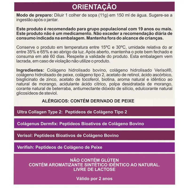 Ingredientes: colágeno Hidrolisado Bovino, Colágeno Hidrolisado Verisol, Colágeno Hidrolisado do Peixe, Colágeno Tipo 2, Acetato de Retinol, Ácido Ascórbico, Biotina, Poupa Desidratada de Morango.CONTÉM DERIVADO DE PEIXE.