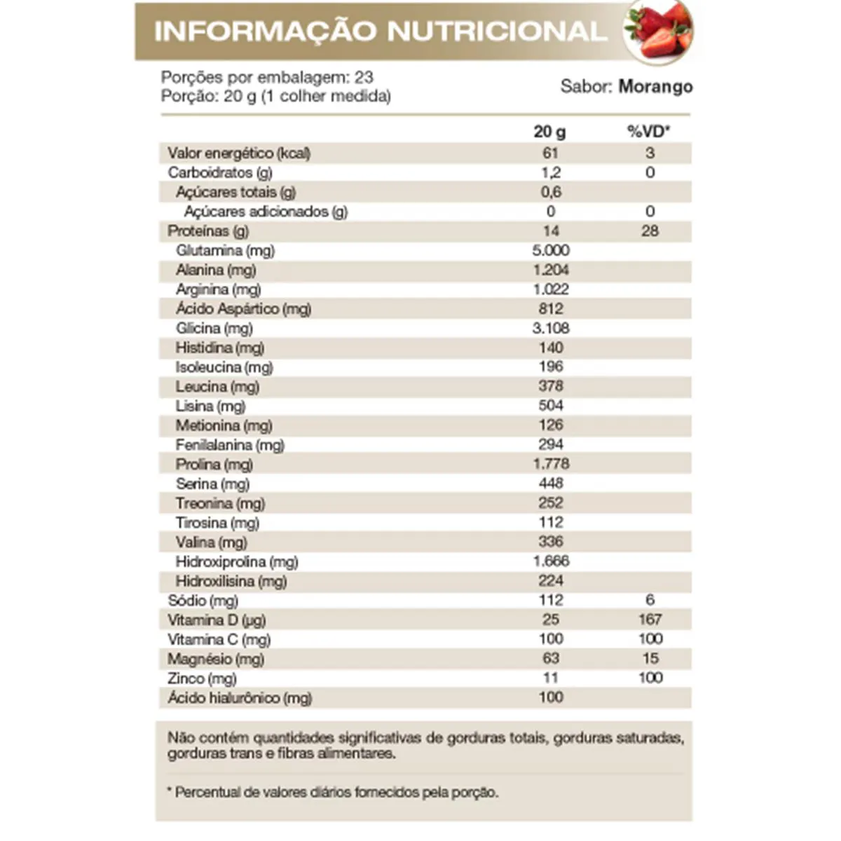 Kit 3 Colagentek Protein Vitafor Morango 460g Sobre o produto COLAGENTEK® PROTEIN é um suplemento à base de colágeno hidrolisado com a tecnologia BODYBALANCE®, adicionada aos ingredientes: glutamina, ácido hialurônico, vitaminas C e D, magnésio e zinco. Manter a saúde muscular é um desafio que só aumenta com o passar da idade. Os músculos são essenciais para a mobilidade, proteção dos órgãos e ossos. Muitas vezes os músculos são vistos apenas pelo lado estético, mas eles são uma questão de saúde. Benefícios - A vitamina d e o magnésio auxiliam no funcionamento muscular e na formação de ossos e dentes; - A vitamina D auxilia na absorção de cálcio e fósforo e na manutenção de níveis de cálcio no sangue; - A vitamina c auxilia na absorção de ferro dos alimentos, na formação de colágeno, na regeneração da forma reduzida da vitamina e e no metabolismo de proteínas e gorduras; - O magnésio e o zinco auxiliam no metabolismo de proteínas carboidratos e gorduras e no processo de divisão celular.no metabolismo de proteínas cadivisão celular; Modo de usar Dissolva 20g (1 colher medida) em 100mL de água ou na sua bebida preferida e misture até total homogeneização. Beba imediatamente após o preparo. Ingredientes Sabor Morango: Colágeno hidrolisado, L-glutamina, bisglicinato de magnésio (magnésio), hialuronato de sódio obtido pela fermentação de Streptococcus zoopidemicus, ácido ascórbico (vitamina C), bisglicinato de zinco (zinco), colecalciferol (vitamina D3), aroma idêntico ao natural, acidulante ácido cítrico, antiumectante dióxido de silício, espessante goma xantana, corante carmin e edulcorantes glicosídeos de esteviol (estévia) e taumatina.