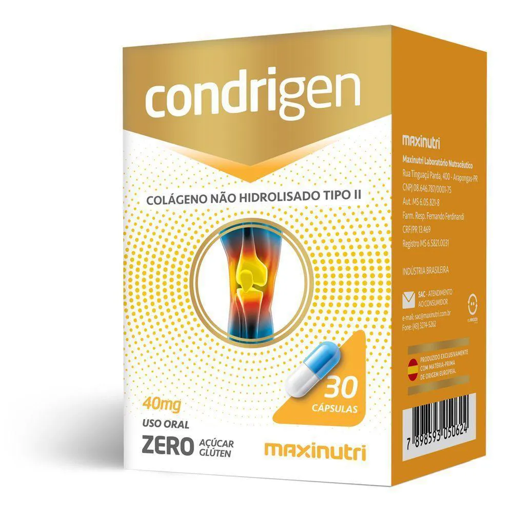Kit 3 Condrigen Colágeno Tipo 2 Maxinutri 30 CápsulasO Condrigen Colágeno Tipo 2 da Maxinutri é um suplemento alimentar que contém colágeno do tipo 2. Aqui estão alguns dos possíveis benefícios associados ao consumo deste suplemento:Saúde das articulações: O colágeno tipo 2 é uma proteína encontrada principalmente nas cartilagens das articulações. Consumir colágeno tipo 2 pode ajudar a fortalecer as articulações, melhorar a ibilidade e a mobilidade articular, e promover a saúde das cartilagens.Redução da dor e inflamação: Suplementar com colágeno tipo 2 pode ajudar a reduzir a dor e a inflamação nas articulações, o que pode ser especialmente benéfico para pessoas com condições como osteoartrite, artrite reumatoide ou lesões articulares.Regeneração da cartilagem: O colágeno tipo 2 é um componente importante da estrutura da cartilagem articular. Consumir colágeno tipo 2 pode ajudar a promover a regeneração da cartilagem danificada, contribuindo para a saúde a longo prazo das articulações.Prevenção de lesões articulares: Ao fortalecer as articulações e promover a saúde das cartilagens, o Condrigen Colágeno Tipo 2 pode ajudar a prevenir lesões articulares decorrentes de atividades físicas intensas ou do envelhecimento.Melhora da mobilidade e qualidade de vida: Reduzir a dor e a inflamação nas articulações pode melhorar significativamente a mobilidade e a qualidade de vida, permitindo que as pessoas realizem suas atividades diárias com mais facilidade e conforto.Ingredientes