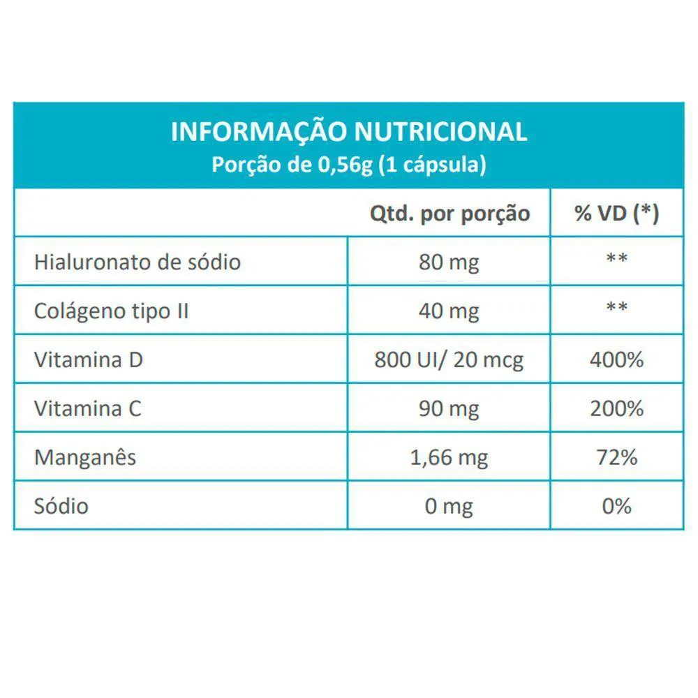 Colágeno não hidrolisado tipo II em Pó (UC-II), hialuronato de sódio (fonte de ácido hialurônico – Haplex Plus), manganês, vitamina C, vitamina D, excipiente: silicato de magnésio, carbonato de magnésio, estearato de magnésio, crospovidona, antiumectante: