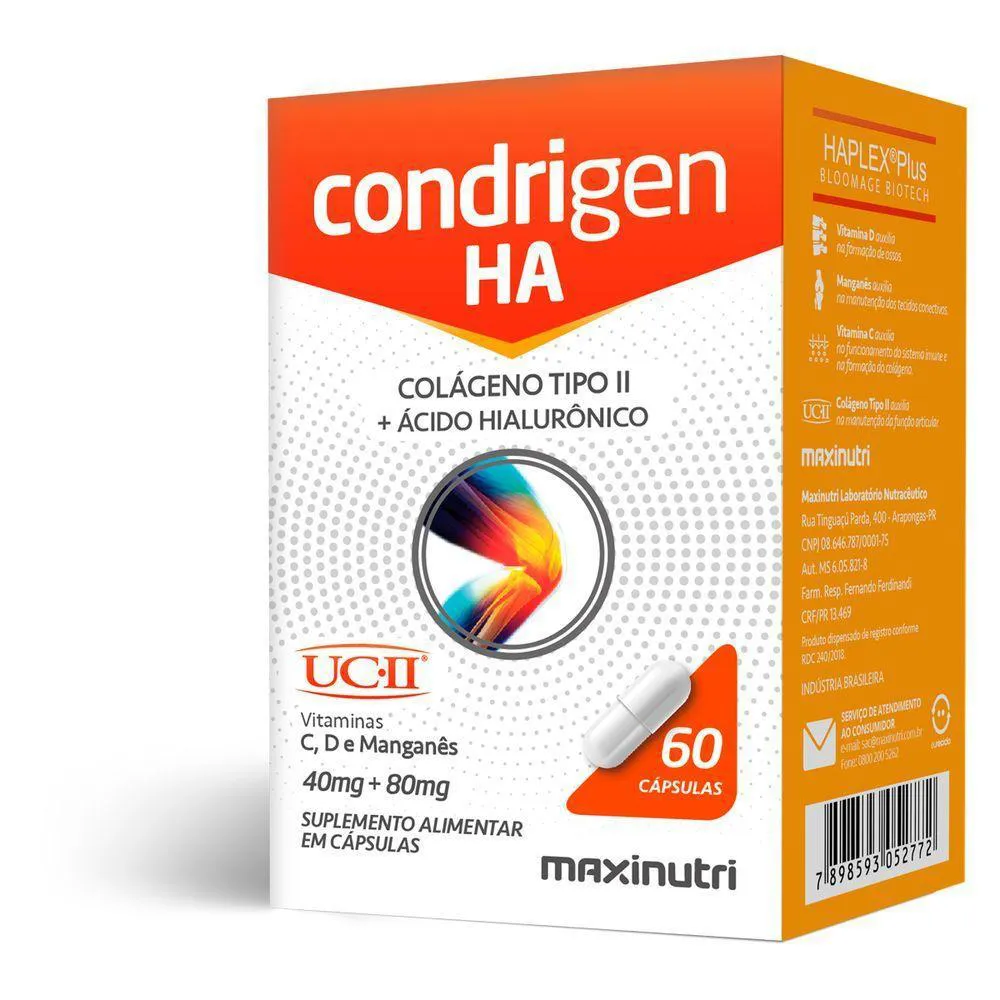 Kit 3 Condrigen HÁ Colágeno Tipo 2 Maxinutri 60 CápsulasO Condrigen HÁ Colágeno Tipo 2 da Maxinutri é um suplemento alimentar formulado para promover a saúde das articulações. Aqui estão alguns dos benefícios associados ao Condrigen HÁ Colágeno Tipo 2:Saúde das Articulações: O colágeno tipo 2 é uma proteína presente na cartilagem das articulações. A suplementação com colágeno tipo 2 pode ajudar a promover a saúde das articulações, fornecendo os nutrientes essenciais necessários para a regeneração e manutenção da cartilagem articular.Redução da Dor e Rigidez: Para pessoas que sofrem de condições articulares como osteoartrite ou artrite reumatoide, o colágeno tipo 2 pode ajudar a reduzir a dor, a inflamação e a rigidez nas articulações, melhorando assim a mobilidade e a qualidade de vida.Melhora da Flexibilidade: A suplementação com colágeno tipo 2 pode ajudar a aumentar a flexibilidade das articulações, tornando mais fácil a realização de atividades diárias e exercícios físicos.Proteção das Cartilagens: O colágeno tipo 2 é um componente importante da estrutura da cartilagem articular. A suplementação pode ajudar a proteger as cartilagens das articulações contra o desgaste e a degeneração, contribuindo para a prevenção de problemas articulares no futuro.Recuperação de Lesões: Para atletas e pessoas ativas, o colágeno tipo 2 pode ajudar na recuperação de lesões articulares, como entorses e distensões, promovendo a cicatrização e a regeneração do tecido cartilaginoso.A vitamina d: Auxilia na formação de ossos e dentes; Auxilia na absorção de cálcio e fósforo; Auxilia no funcionamento do sistema imune; Auxilia no funcionamento muscular; Auxilia na manutenção de níveis de cálcio no sangue; Auxilia no processo de divisão celular.A vitamina c: Auxilia na absorção de ferro dos alimentos; Auxilia na proteção dos danos causados pelos radicais livres; Auxilia no funcionamento do sistema imune; Auxilia na formação do colágeno; Auxilia na regeneração da forma reduzida da vitamina e; Auxilia no