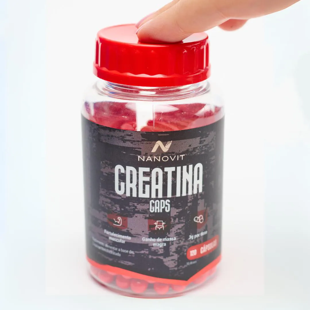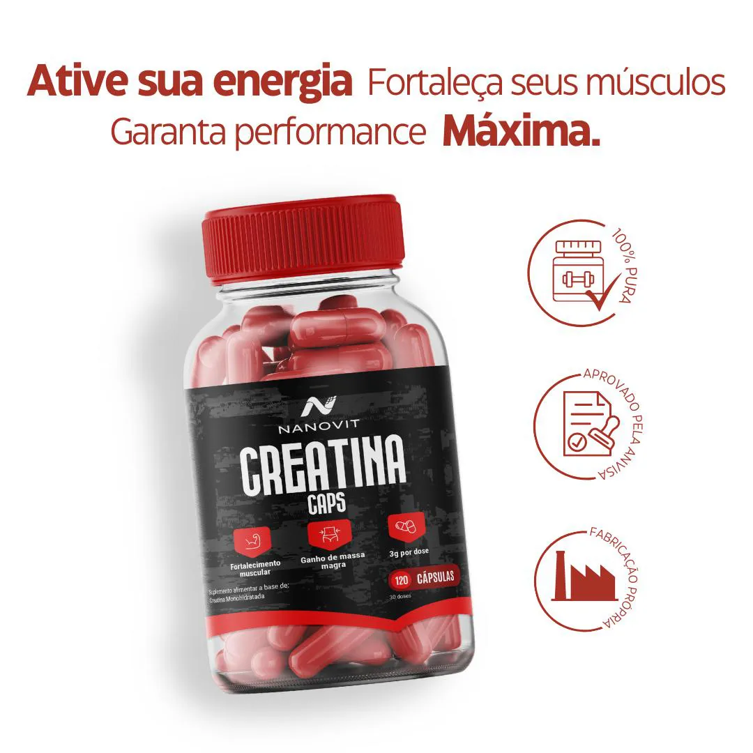 creatina Monohidratada 100% Pura 120 Cápsulas – Nanovit A creatina é um composto natural encontrado no corpo humano, principalmente nos músculos, e pode ser obtida através da alimentação (carnes e peixes) ou suplementação. Diferenciais: · Praticidade da cápsula. · 100% pura. · Produto 100% Natural e direto da fábrica para sua casa. Ação de cada nutriente: A creatina é fonte poderosa de produção de energia, traz força e disposição, tem efeito anti-inflamatório, retarda o envelhecimento muscular, grande aliada no ganho de massa magra e na recuperação em qualquer atividade física. Como Usar: · Concentração de Creatina é de 750mg por cápsula, e a ingestão diária recomendada é de 4 cápsulas (3g de creatina). · Pode ser consumido a qualquer hora do dia, de acordo com sua rotina. Consistência é o mais importante. Recomendações: · Manter fora do alcance de crianças e seguir a dose diária recomendada. · Orientamos sempre que gestantes, lactantes ou pessoas com doenças crônicas, procurem orientação de profissional da saúde para uso de qualquer suplementação. · Consumir junto com alimentos para facilitar sua assimilação. Conservação: · Armazenar em local seco e fresco, ao abrigo da luz. · Consumir em até 30 dias após aberto. Nanovit Nutrition A Nanovit é uma marca com mais de 20 anos de experiência no desenvolvimento e fabricação de suplementos e vitaminas 100% naturais e integrativas. Reconhecida pela abordagem abrangente, tem como pilar o diferencial no desenvolvimento de produtos completos, que preenchem as lacunas nutricionais necessárias para o pleno funcionamento do nosso corpo, com transparência e matérias primas de qualidade e importadas. Todos os nossos produtos são exclusivos, com fabricação própria, registrados e homologados pela ANVISA. Aviso legal · Idade mínima recomendada: 19 anos. · Não Contém Glúten.