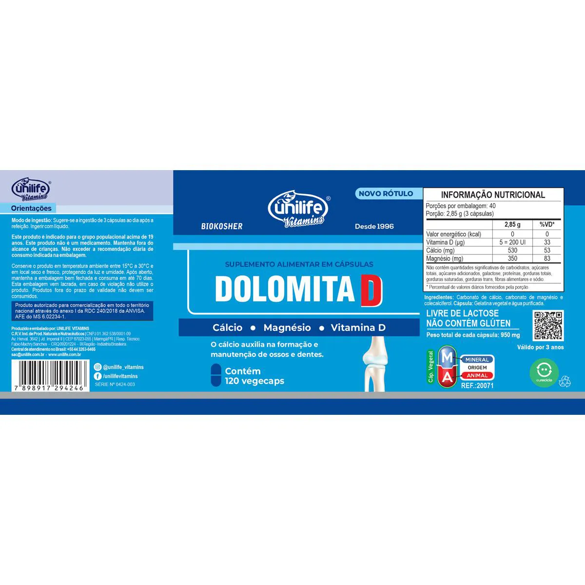 Dolomita com vitamina d da Unilife - 120 Cápsulas Dolomita com vitamina D da Unilife é um suplemento alimentar cuidadosamente formulado para contribuir com uma dieta equilibrada e fornecer nutrientes essenciais para o bem-estar. Cada frasco contém 120 cápsulas, que combinam os benefícios do cálcio e magnésio presentes na dolomita com a potência da Vitamina D, crucial para a absorção desses minerais. O produto é ideal para quem busca complementar a ingestão de cálcio e magnésio, e aproveitar as vantagens da Vitamina D de forma prática e conveniente. As cápsulas são feitas com ingredientes de alta qualidade, garantindo uma suplementação segura e eficaz. Unilife é uma marca comprometida com a transparência e qualidade, oferecendo produtos que atendem aos rigorosos padrões de produção e controle de qualidade. A Dolomita com Vitamina D é uma excelente adição à rotina diária, ajudando a manter o equilíbrio nutricional e o bem-estar geral. Este produto contém cálcio, magnésio e vitamina D. Além disso, é vegano e livre de glúten e lactose. Produto autorizado para comercialização em todo o território nacional através do anexo I da RDC 27/2010, em conformidade com a RDC 23/2000 da ANVISA. AFE do MS 6.02234-1.