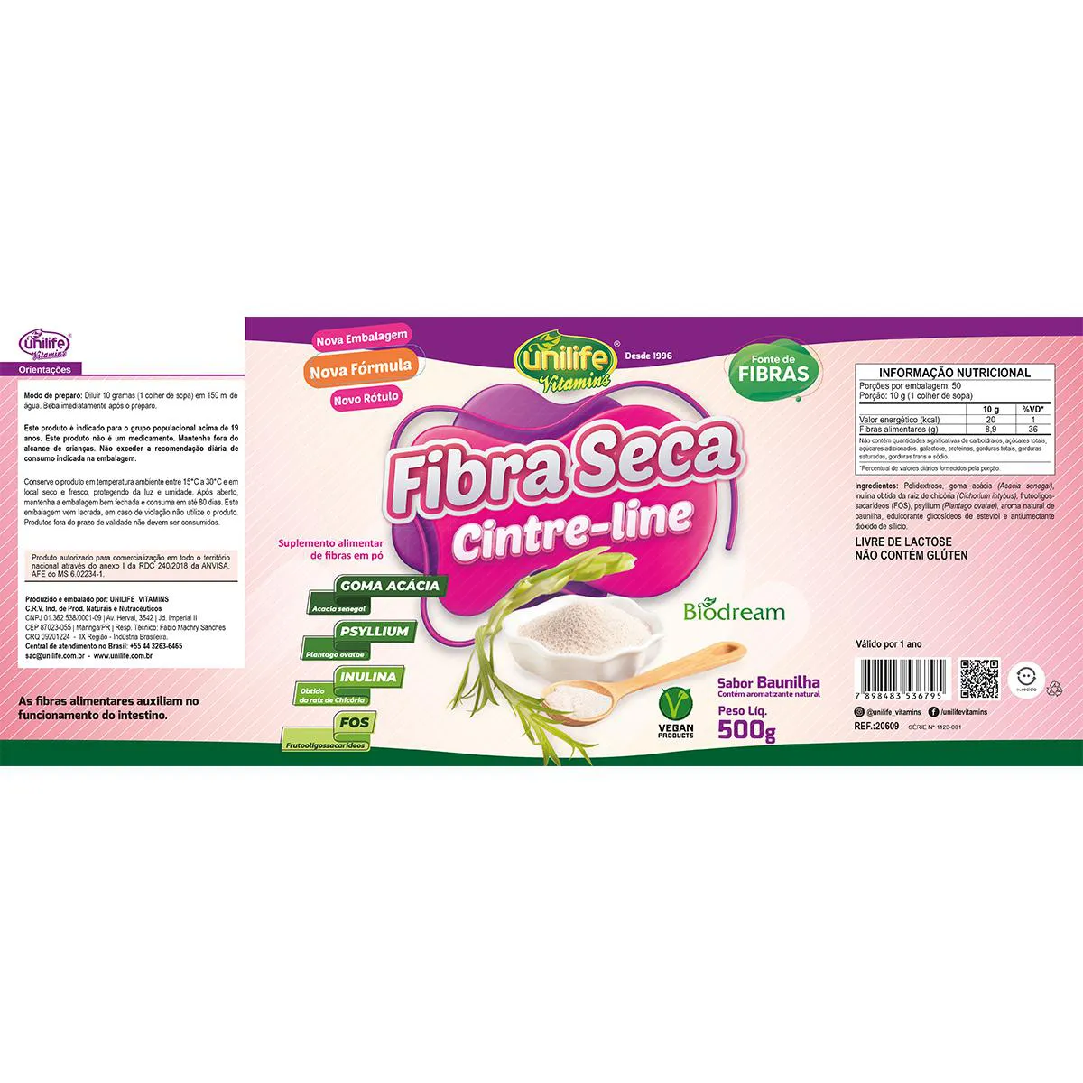 probióticos têm curto período de vida e a contribuição dos PREBIÓTICOS é muito significante, pois promove o aumento da sobrevivência dos microrganismos benéficos presentes no cólon. A fermentação de prebióticos no cólon produz a biomassa bacteriana, aumenta a massa fecal, contribuindo para a melhoria do trânsito intestinal e prevenindo a constipação. Modo de uso: Diluir 10g (1 colher de sopa), em 150ml de água, preferencialmente gelada. Ingredientes: Polidextrose, goma acácia (Acacia senegal), inulina obtida da raiz chicória (Cichorium intybus), frutooligos-sacarídeos (FOS), psyllium (Plantago ovatae), aroma natural de baunilha, edulcorante glicosídeos de esteviol e antiumectante dióxido de silício. LIVRE DE LACTOSE NÃO CONTÉM GLÚTEN Produto autorizado para comercialização em todo o território nacional através do anexo I da RDC 240/2018 da ANVISA. AFE do MS 6.02234-1.