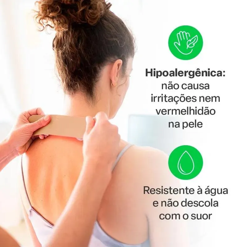 Hipoalergênica: não causa irritações na pele. Resistente à água e suor, e não descola com facilidade da pele.