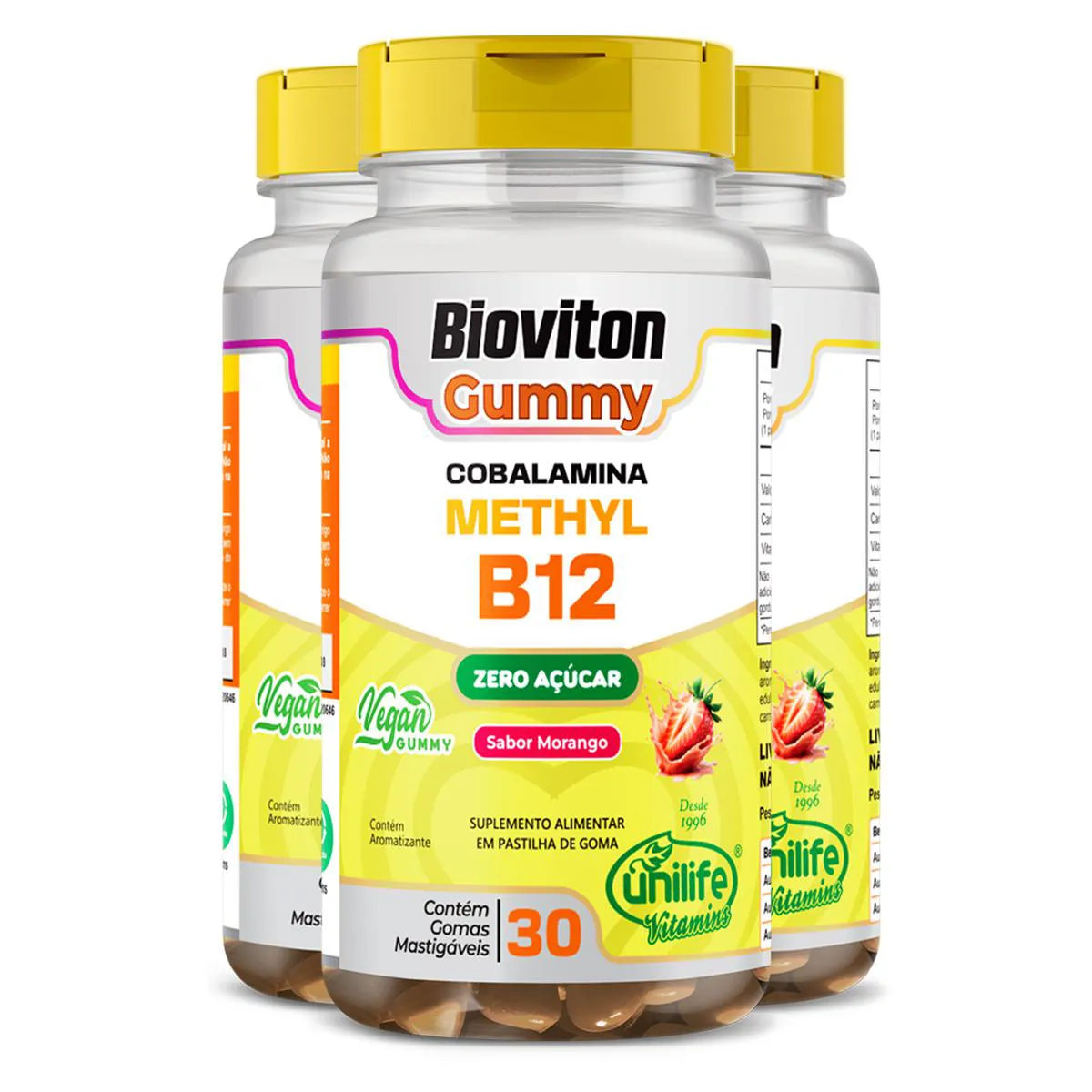 Kit 3 Gummy vitamina B12 Methyl Unilife 30 gomas Morango