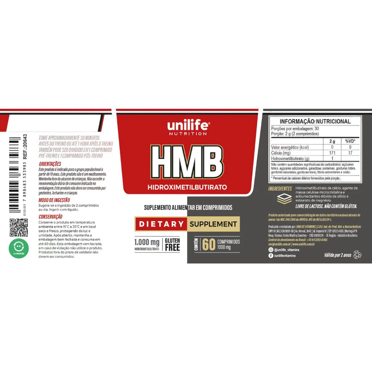 O HMB Unilife é um suplemento nutricional composto por hidroximetilbutirato de cálcio, desenvolvido para auxiliar pessoas que buscam uma composição equilibrada e de qualidade, sendo livre de lactose e glúten. Destina-se a indivíduos a partir de 19 anos que desejam suporte nutricional, podendo ser consumido antes ou após treinos, com recomendação de ingestão de 2 comprimidos diários.